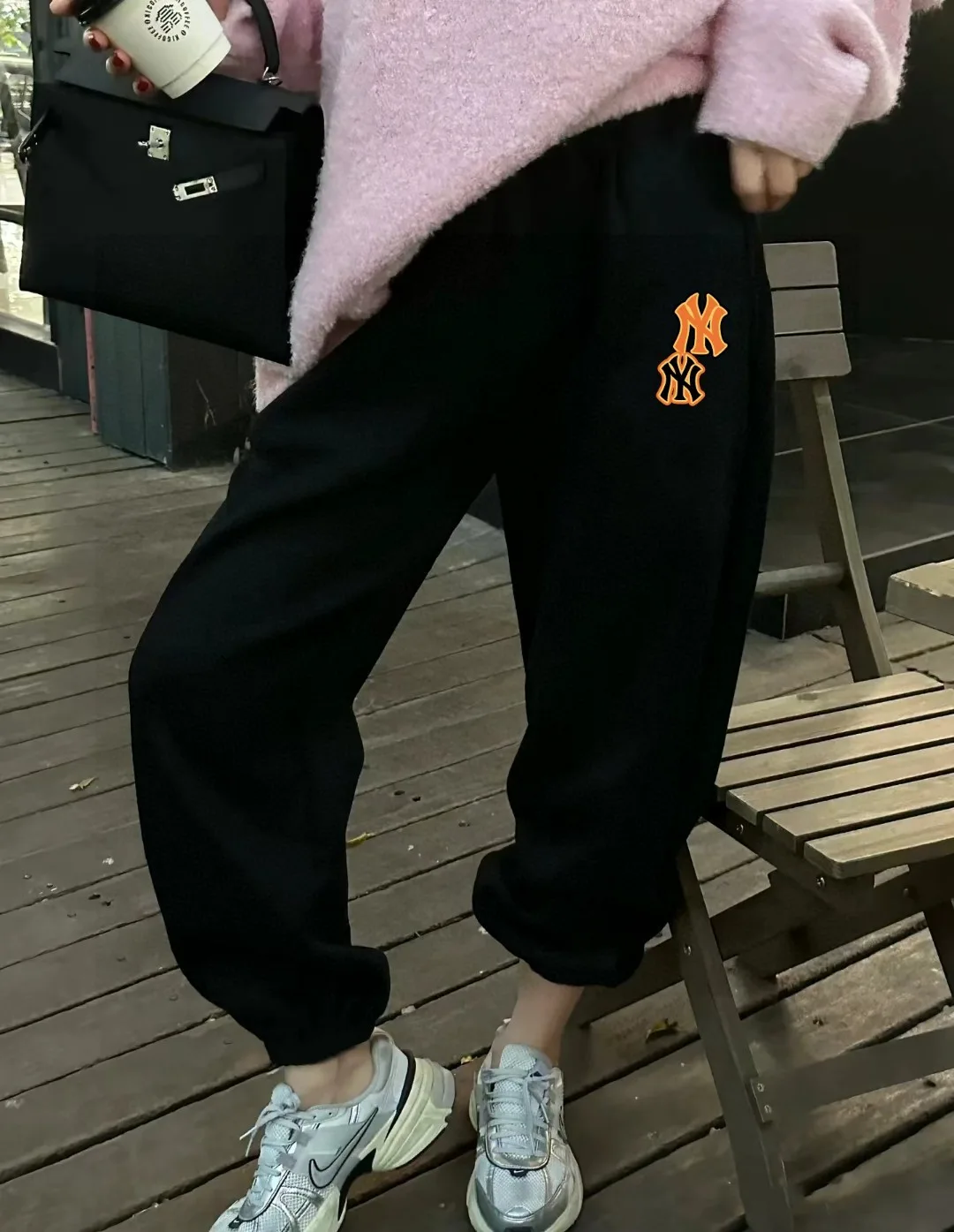 Unisex-Jogginghose für Paare mit orangefarbenem MLB/NY-Logo-Print im Doppel-Stempel-Design