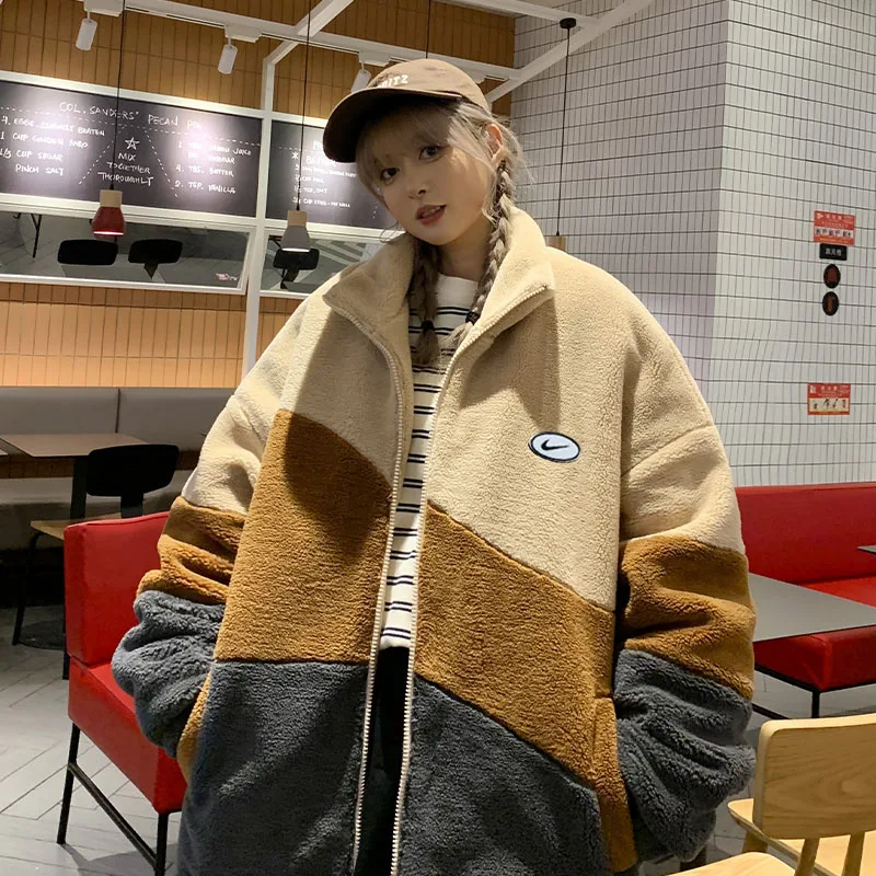 Laoyoutiaos neue Nike/Nike Overseas limitierte dreifarbige Patchwork-Pufferjacke aus dickem Lammfell im Unisex-Stil. Die tief ausgeschnittene Silhouette ist unglaublich trendig und schmeichelt der Figur. Der weiche, bequeme Stoff wurde mehrfach überarbeitet und lässt sich so mühelos sowohl mit Sweatshirt als auch mit Hemd kombinieren. Die trendigen Farben sind ein echter Hingucker und machen die Jacke zu einem stylischen Streetstyle!