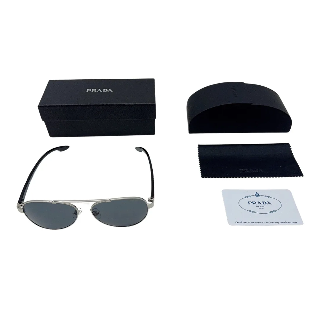Prada Smart and Enterprising Kollektion, Elegante Business Executive Edition für Herren, hochauflösende Pilotensonnenbrille in Froschform, silbergrauer Rahmen, schwarze polarisierte Gläser. Prada Sonnenbrillen sind für ihr einzigartiges und stilvolles Design bekannt. Sie zeichnen sich typischerweise durch einen minimalistischen, eleganten Stil mit Liebe zum Detail und hochwertigen Materialien wie hochwertigem Acetat, Metall oder anderen innovativen Materialien aus. Diese Materialien sorgen für Komfort, Haltbarkeit und Stil. Das Markenlogo wird oft dezent und raffiniert auf Bügeln, Rahmen oder Gläsern präsentiert. Es dient als Symbol für Markenidentität und Qualität. Die Gläser bieten typischerweise hervorragenden UV-Schutz, reduzieren Blendeffekte und verbessern die klare Sicht. Einige Modelle verfügen außerdem über spezielle Linsenbehandlungen wie Kratzfestigkeit, Entspiegelung oder Polarisation.