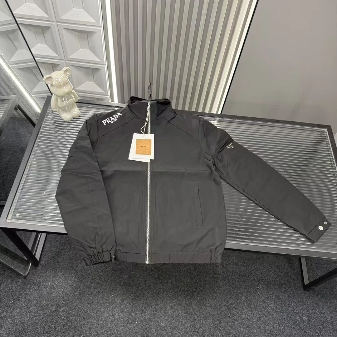 Empfohlene Oberbekleidung für den Frühherbst: Pradas Windjacke mit Stehkragen und Dreiecksprägung. Alle drei Etiketten sind identisch mit denen auf der offiziellen Website. Zoomen Sie hinein, um Details zu sehen. Foto mit der Originalkamera aufgenommen.