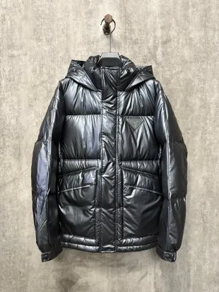 Prada Winterneuheit: Hochwertige Daunenjacke mit Kapuze und Lederlabel.