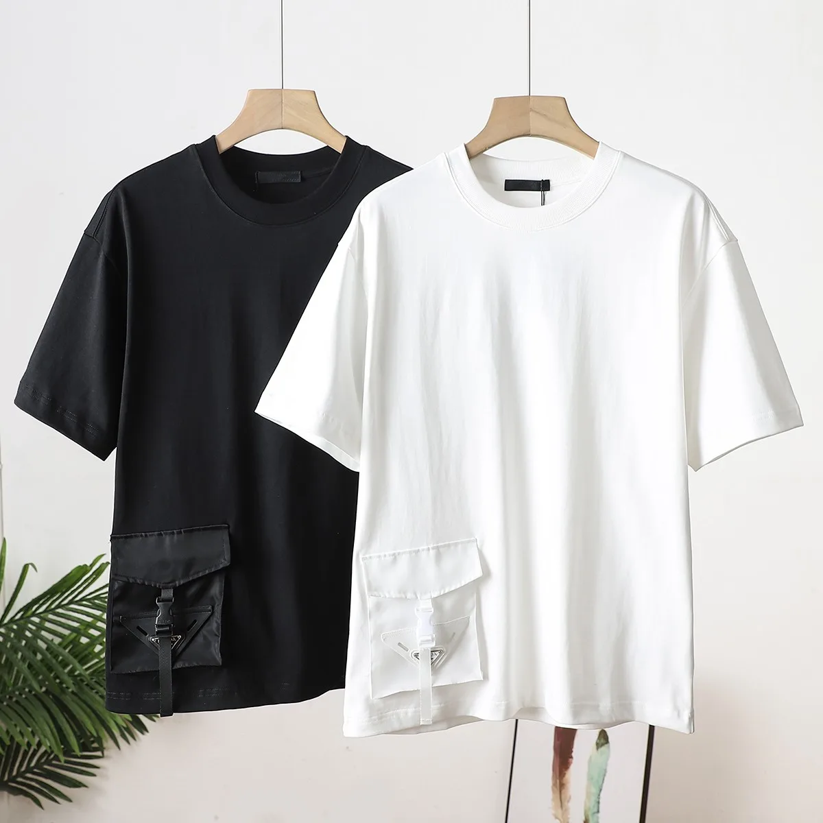 Pradas neuestes Unisex-T-Shirt aus Baumwolle mit Rundhalsausschnitt und kurzen Ärmeln in Unifarbe mit Taschen.