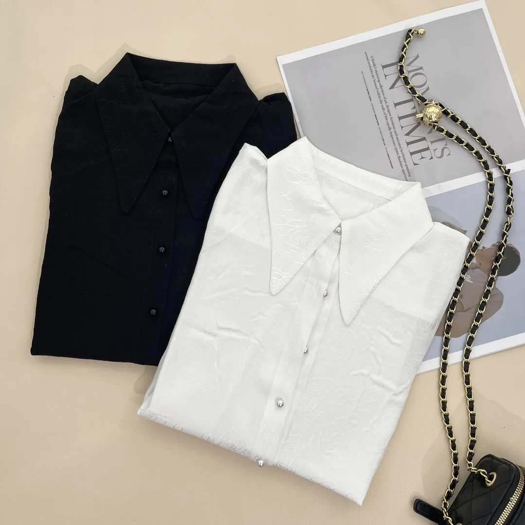 Sandros französisches Vintage-Jacquard-3D-Hemd. Das 3D-Jacquard-Design erzeugt ein nahtloses, strukturiertes Gefühl und sorgt für einen edlen Look. Die geprägte Oberfläche verleiht diesem schlichten, einfarbigen Hemd einen Hauch von Luxus. Es ist glatt und knitterarm. Der klassische Hemdkragen ist glatt und stilvoll. Die Drei-Knopf-Manschetten sorgen für einen edlen Lagenlook. Der schicke Kragen im Retro-Stil ist atemberaubend! Der abgerundete, geschwungene Spitzkragen ist raffiniert und modisch. Das schwere Jacquard-Muster ist exquisit und elegant, mit einem subtilen, weichen Perlglanz, der eine raffinierte, aristokratische Vintage-Ästhetik verkörpert. Dieser subtile Luxus ist dezent, mit einem glatten, zarten Gefühl und einem seidigen Fall. Kombiniert mit einem Anzug, einer Hose oder einem Rock erzeugt dieses Hemd einen eleganten Look. Ich liebe die raffinierte Note des Jacquard-Musters und kann ihm nicht widerstehen! Das geprägte Jacquardmuster schimmert in unterschiedlichem Licht und erzeugt einen dynamischen, natürlichen Schimmereffekt, der dem gesamten Outfit einen Hauch von Glanz verleiht und es zur perfekten Wahl für jeden Anlass macht. Der klassische, gerade Schnitt, die entspannte Passform mit der lockeren, bequemen Silhouette und den klaren Linien sorgt für einen mühelos eleganten und lässigen Look für einen anspruchsvollen Look!