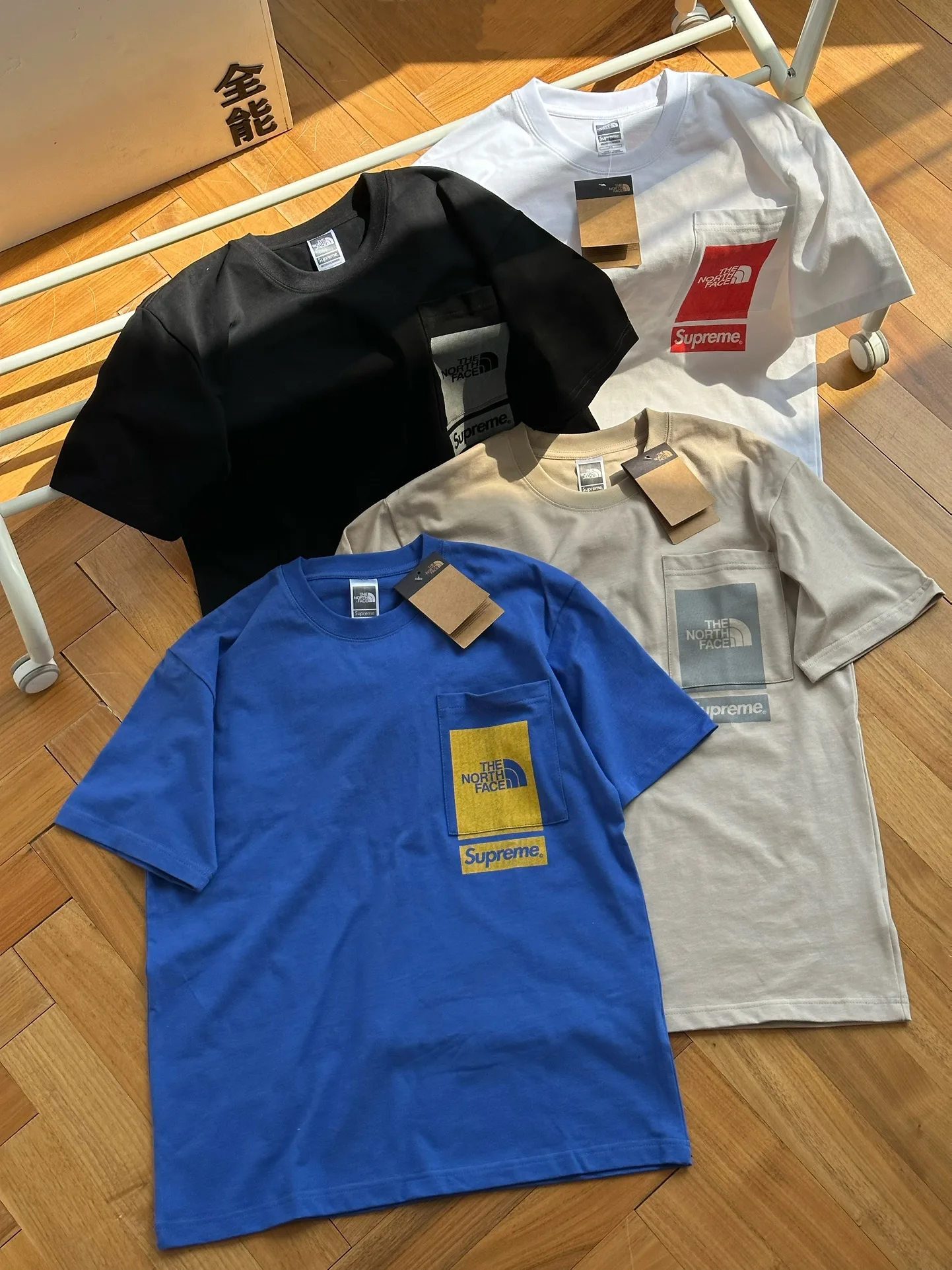 Super SS Week x The North Face Kollaboration, bedrucktes Kurzarm-T-Shirt mit Tasche. Unisex.