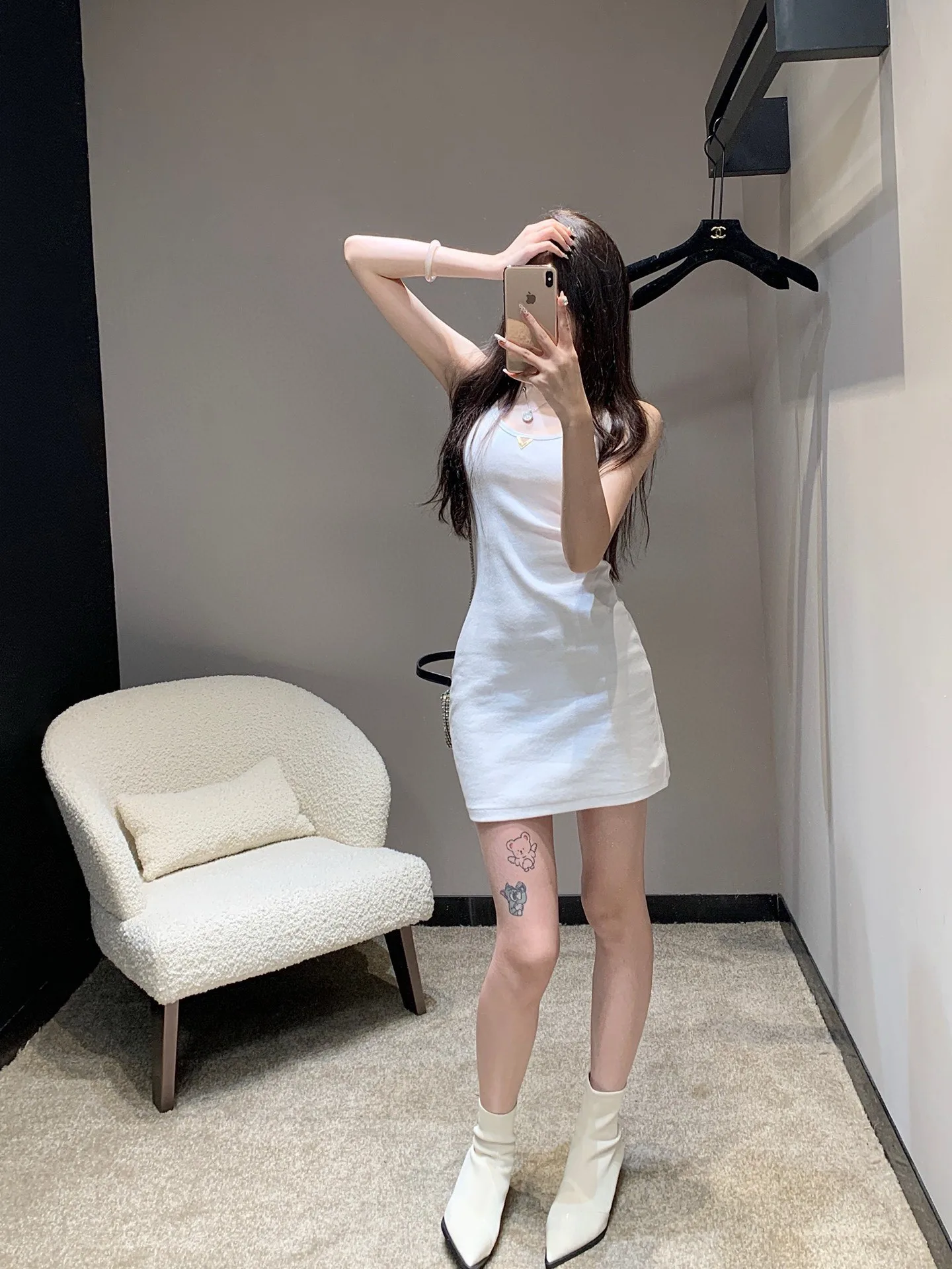 SS Frühjahr/Sommer: Neuer Style: Metallic V-Ausschnitt Tankkleid. Hergestellt aus maßgefertigtem, vertikal gestricktem Stoff aus reiner Baumwolle. Mit klassischen V-förmigen Metalleinlagen auf der Brust. Schlankmachend und schmeichelnd, perfekt allein oder als Unterlage.