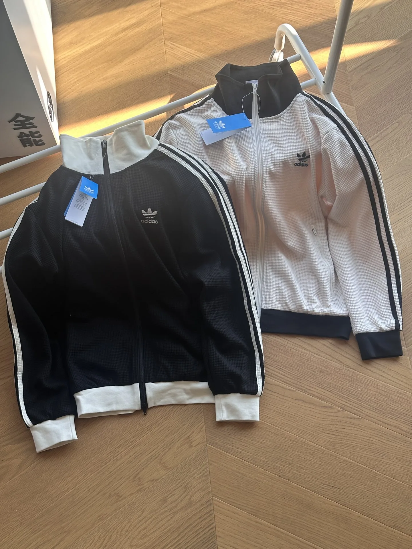 Adidas Originals American Retro Collection: Hochwertige Jacke mit gesticktem Trefoil-Logo und Seitenstreifen. Diese hochwertige, sportliche Stehkragenjacke ist mit einem hochwertigen, doppellagigen Baumwollfutter ausgestattet. Erhältlich in Schwarz und Off-White. Erhältlich in den Größen S–XL. Hergestellt aus originalem Kezhen-Baumwollwaffelstoff mit 100 % Baumwollfutter. Erhältlich in verschiedenen Größen. Das aufwendig gestickte Tajima-Logo auf der Brust wird individuell mit 1:1-Fäden gefertigt. Dieses Premium-Modell ist unisex.