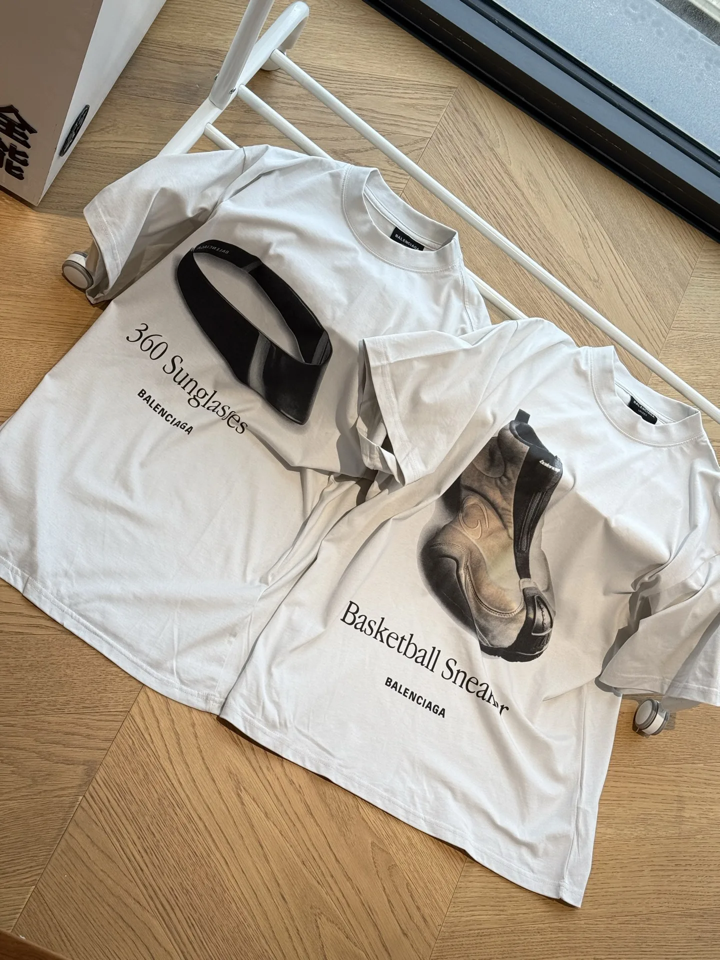 Balenciagas neue Sommerkollektion: Kurzärmliges T-Shirt mit Sonnenbrillen-Print, Goggles und Sneakers.