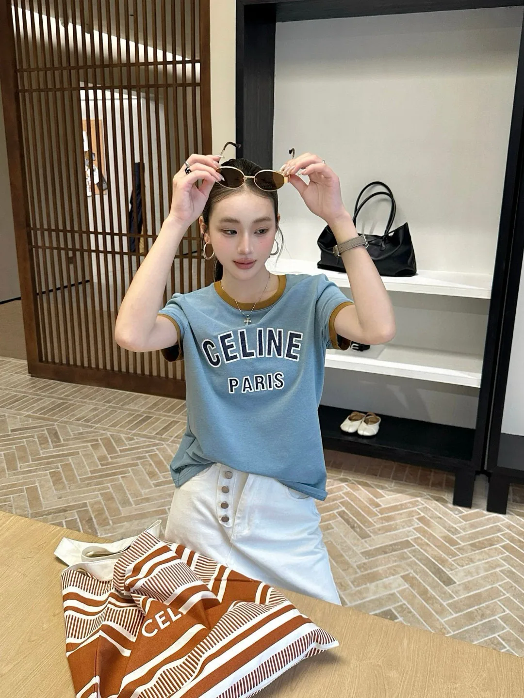 Hochwertiger Celine Kurzarm Blau bestickter Stil