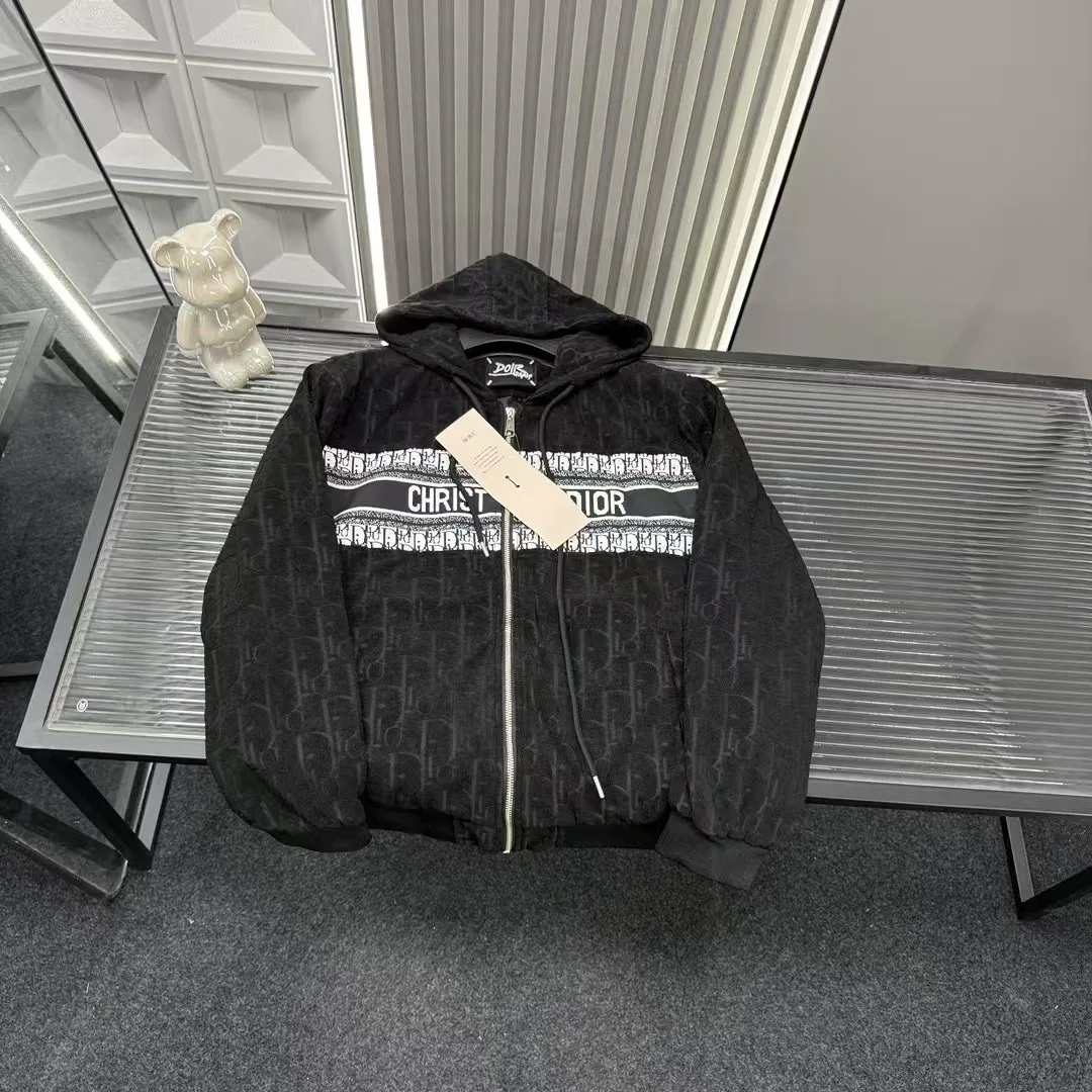 Empfohlene Oberbekleidung für den Frühherbst: Diors Kapuzenjacke mit Monogramm und Bannerschriftzug. Alle drei Logos sind identisch mit denen auf der offiziellen Website. Zoomen Sie hinein, um Details zu sehen. Foto mit der Originalkamera aufgenommen.