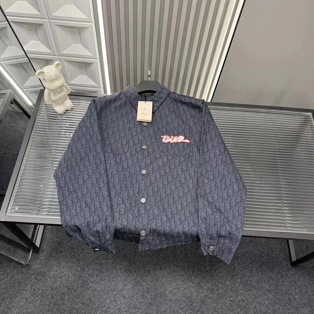Empfohlene Oberbekleidung für den Frühherbst: Diors Jacke mit Allover-Print, Schlangenlogo und gesticktem Revers. Das Logo ist identisch mit dem auf der offiziellen Website. Zoomen Sie hinein, um Details zu sehen. Foto mit der Originalkamera aufgenommen.