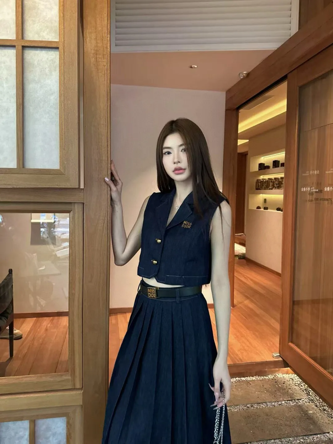 Dior-Monogramm-Jeansweste und Faltenrock mit Gürtel