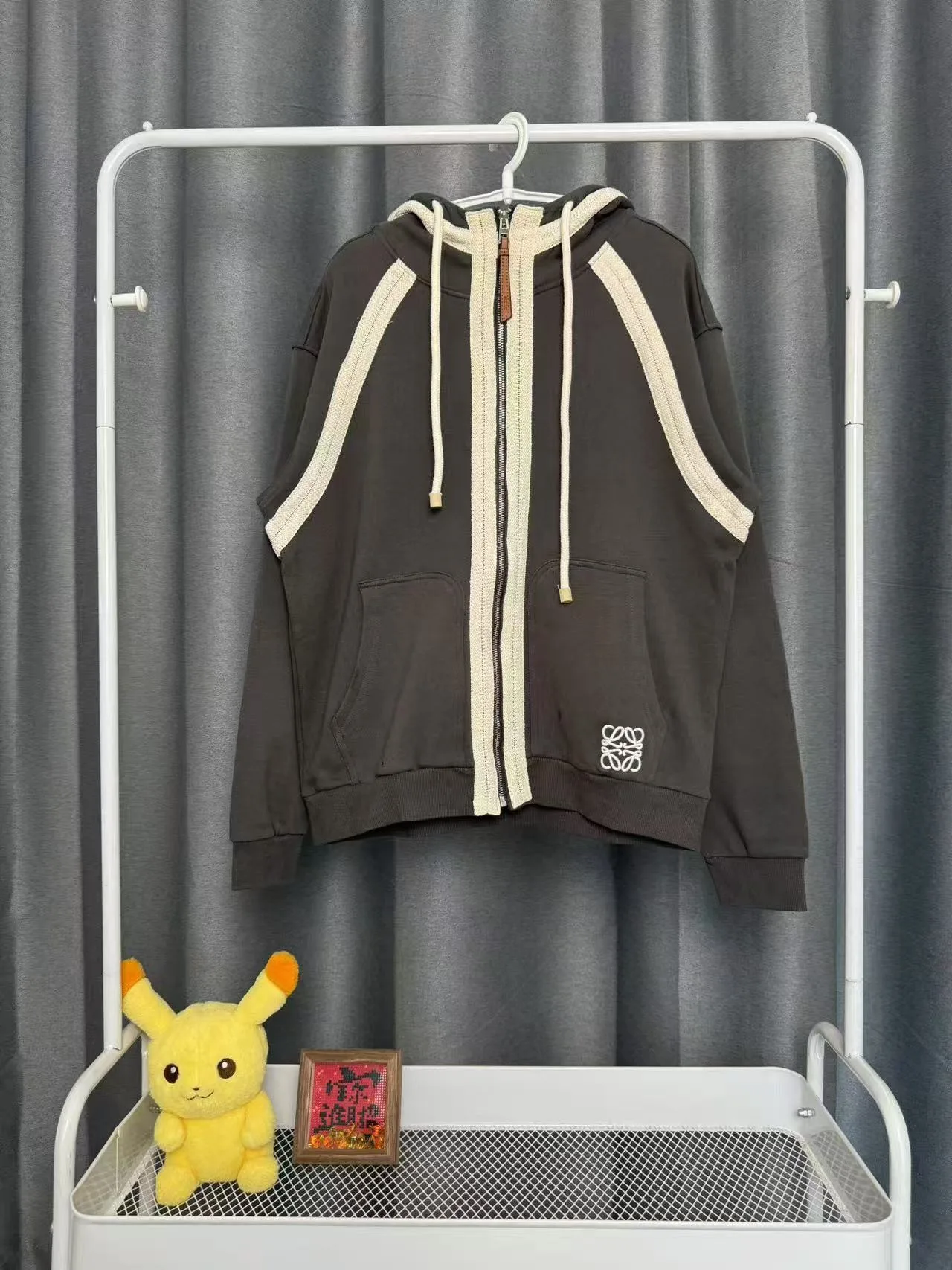 LOEWE Kapuzenjacke mit Reißverschluss und strapazierfähigem Webband. Wir beziehen das Originaldesign und fertigen das Schnittmuster. Alle Besätze werden maßgefertigt. Der Reißverschlussgriff ist mit einem Logo-Schriftzug versehen, und die Kapuzenkordel ist zusätzlich beschwert und geformt, was für einen wirklich exquisiten Look sorgt. Das Webband besteht aus reiner Baumwolle und wird maßgefertigt. Die Herstellung einer solchen Jacke ist unglaublich zeit- und arbeitsintensiv. Das klassische gestickte Logo ist auch darunter sichtbar. Hergestellt aus reinem Baumwollfrottee für höchsten Tragekomfort. Neues Design mit großem Logo. Unisex.