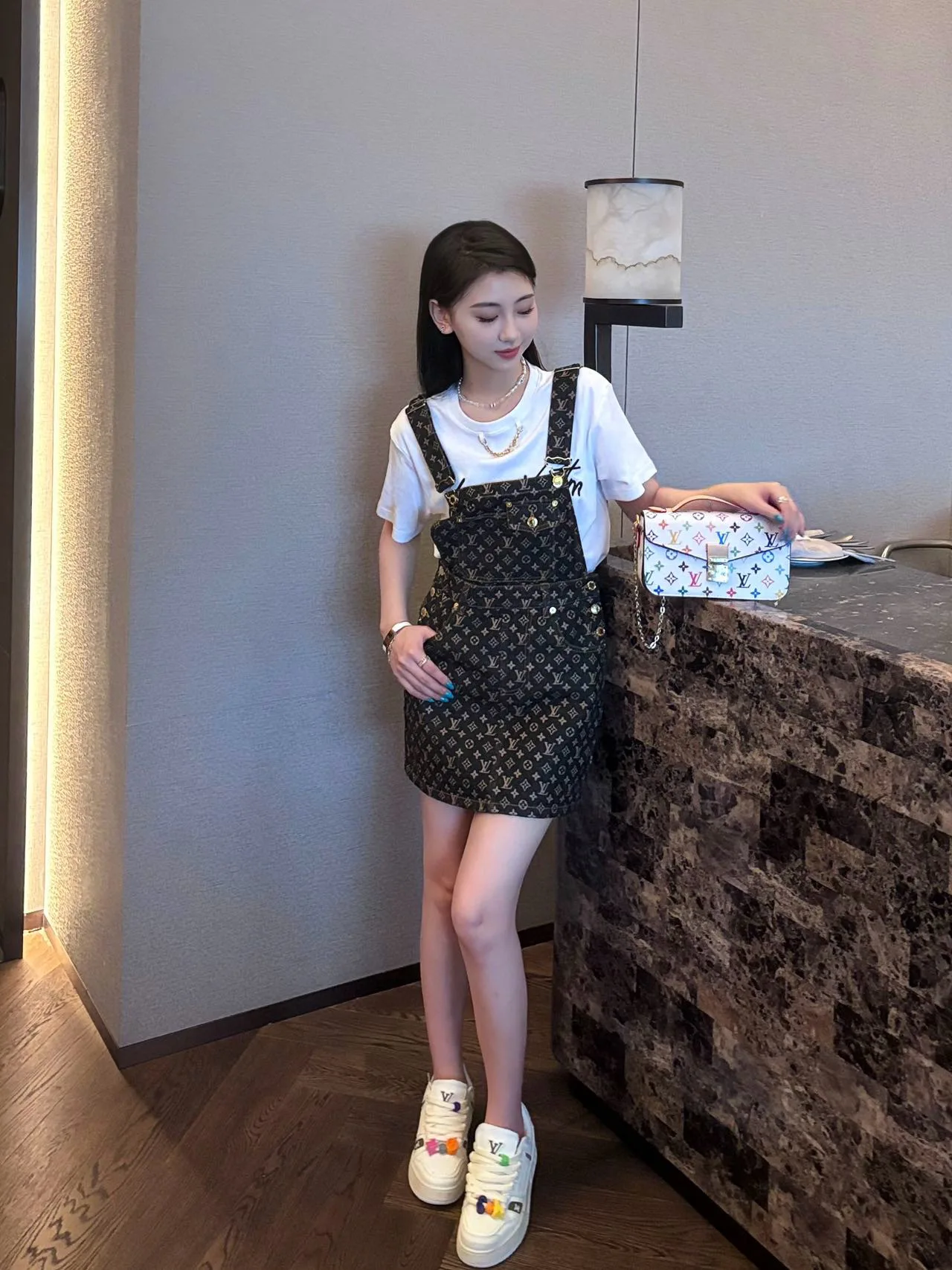 Hochwertiger Louis Vuitton Hosenträgerrock Gold Leder Print Luxus