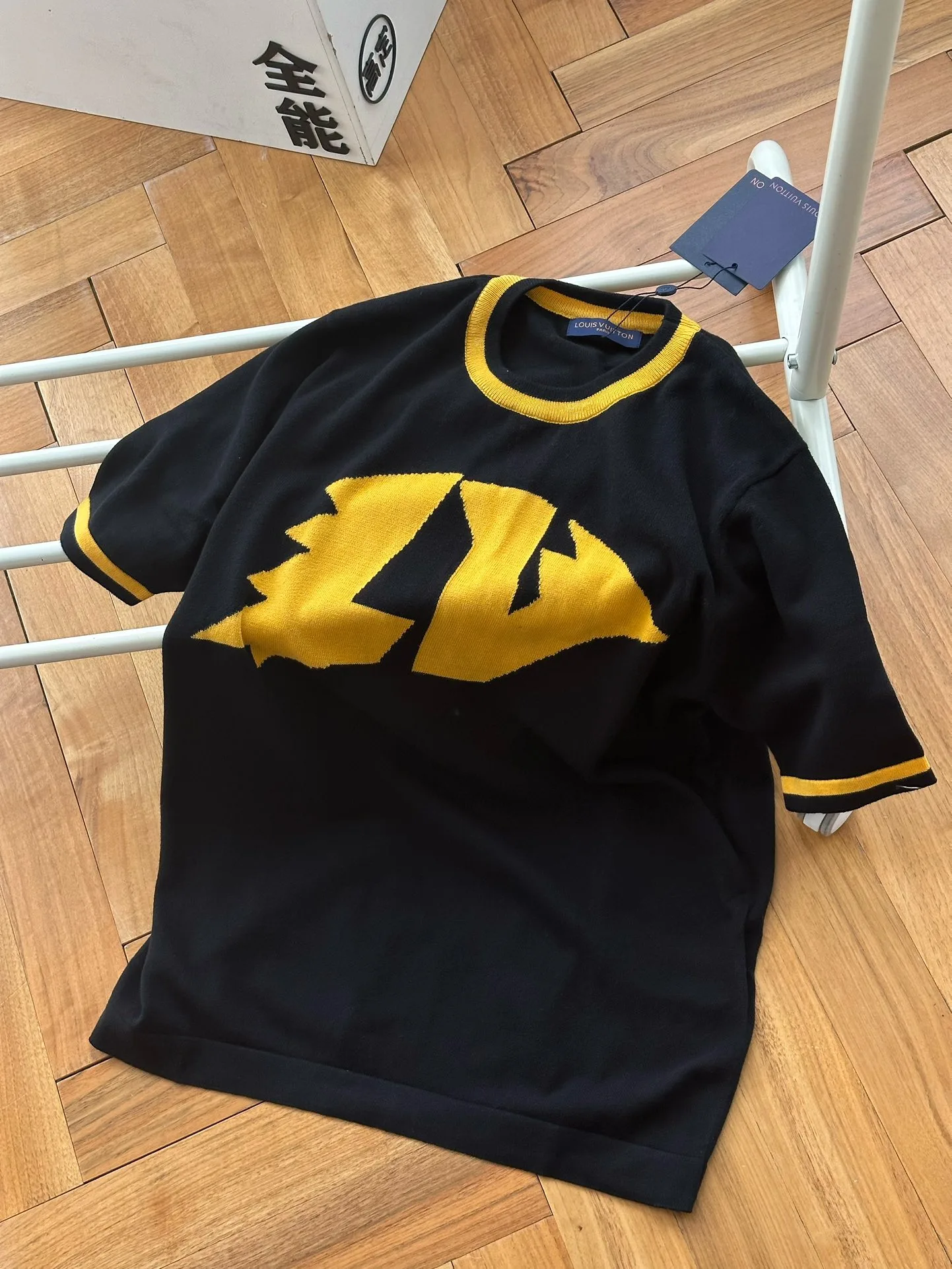 Die gleiche Kurzarmversion ist auch auf Dewu erhältlich. Hochwertiger, individuell gefärbter Strickstoff mit großem gelbem Jacquard-Logo, 100 % authentisch.