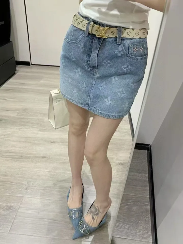 Louis Vuitton LV Custom Leather Brand Vierblättriges Kleeblatt, rosa bestickter Jacquard-Jeansrock mit Gürtel