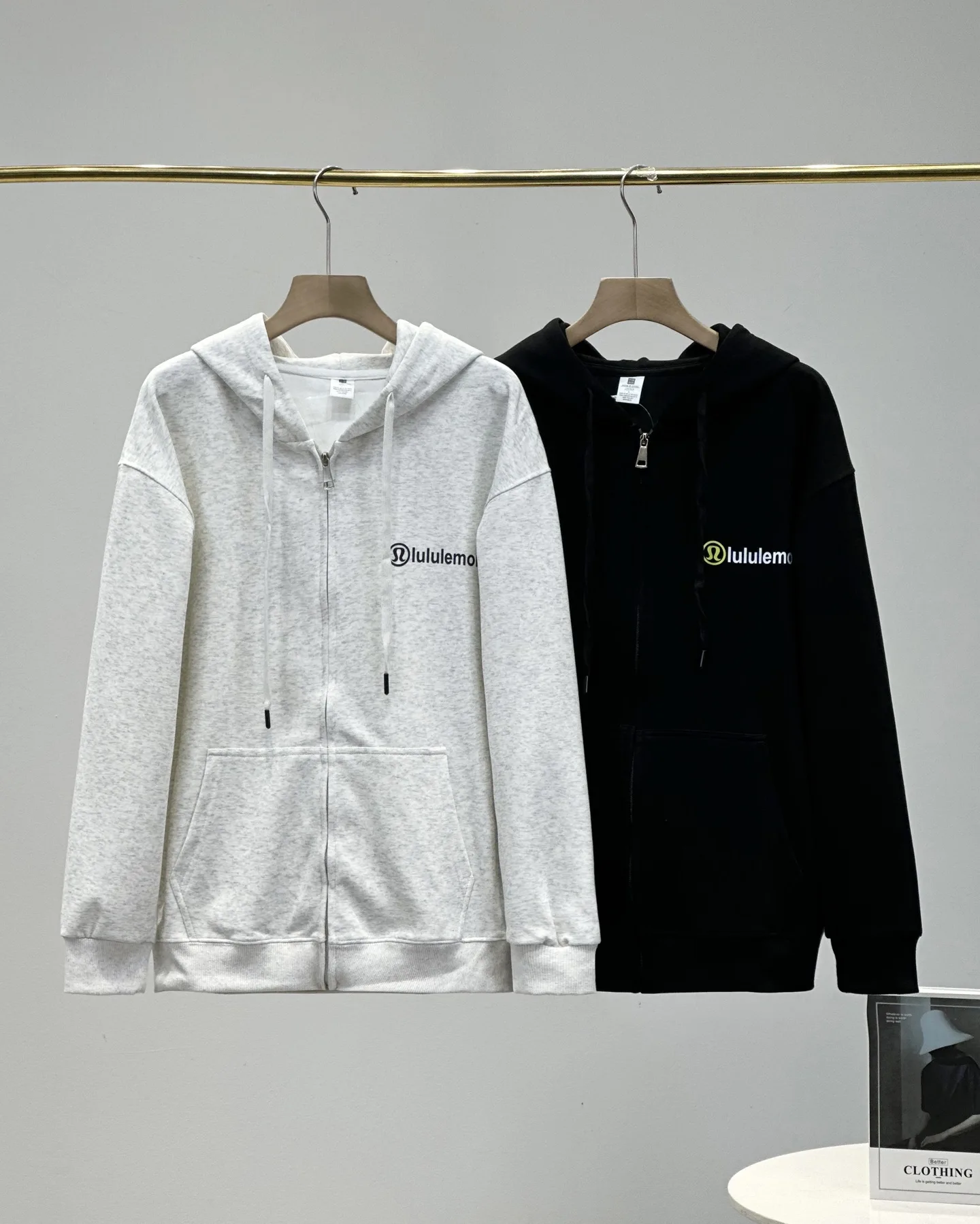 Hier sind ein paar Fotos von lululemons neuer Frühling/Sommer-Freizeitjacke mit Reißverschluss und Hoodie. Diese trendige, locker sitzende, vielseitige Basic-Jacke aus reiner Baumwolle ist perfekt für Männer und Frauen!
