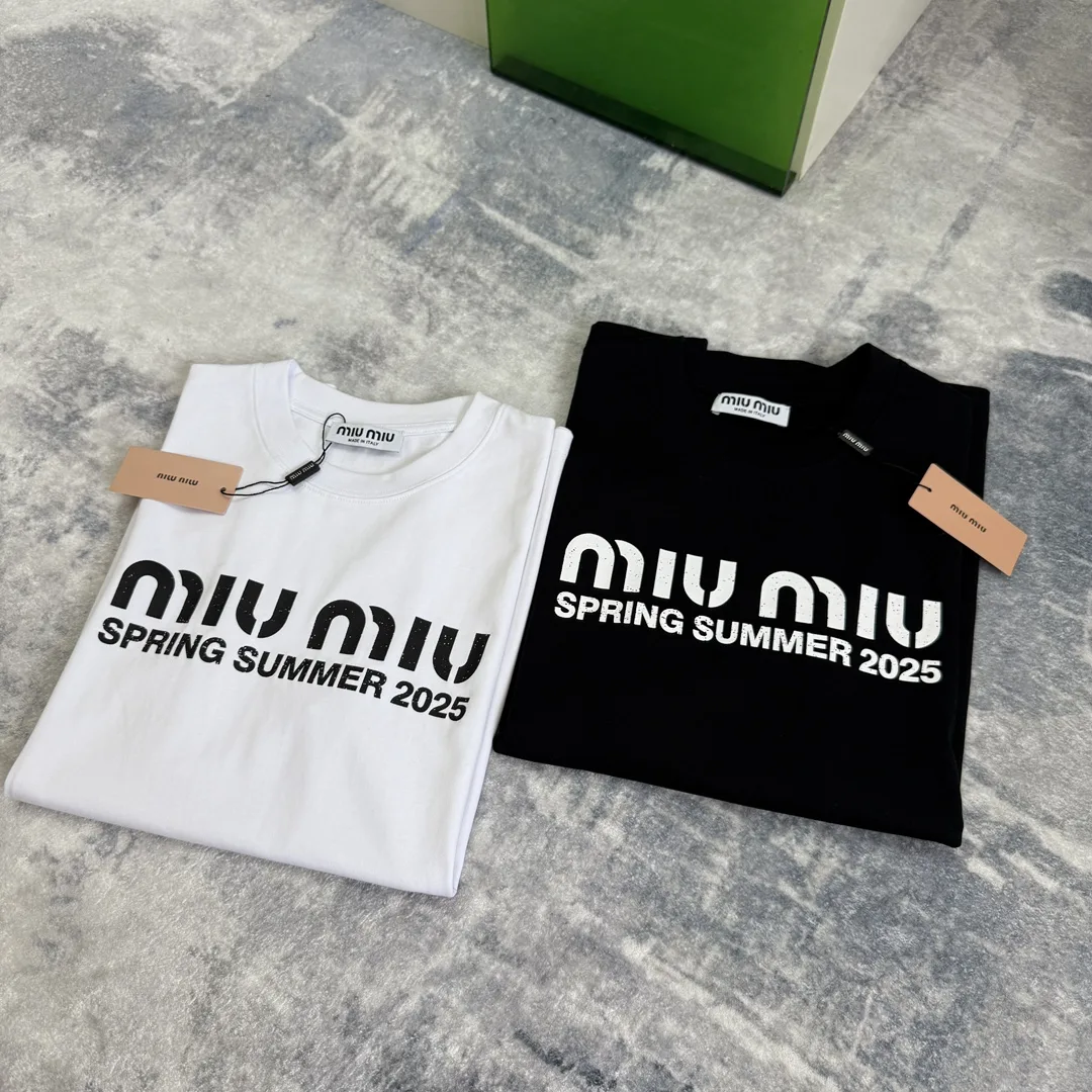 Miu Miu SS Lockeres Kurzarm-T-Shirt mit großem Logo und Schriftzug für Damen und Herren