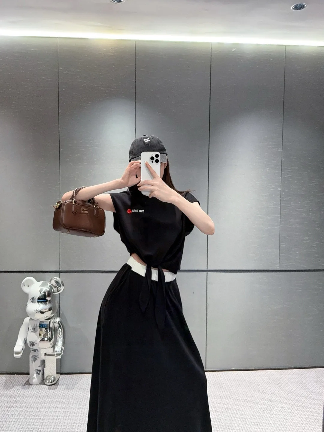 Miumiu Miu Sailing-Stickerei mit kontrastfarbenem Rundhalsausschnitt, Kordelzug-Top und elastischem Rock mit Schlitz in der Taille