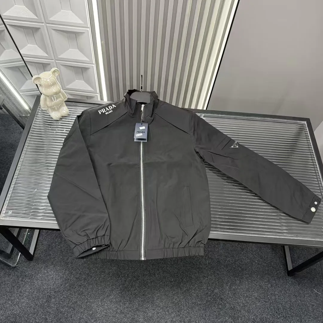 Empfohlene Oberbekleidung für den Frühherbst: Pradas Stehkragenjacke mit Dreiecksprägung und Schriftzug. Alle drei Logos sind identisch mit denen auf der offiziellen Website. Zoomen Sie hinein, um Details zu sehen. Foto mit der Originalkamera aufgenommen.