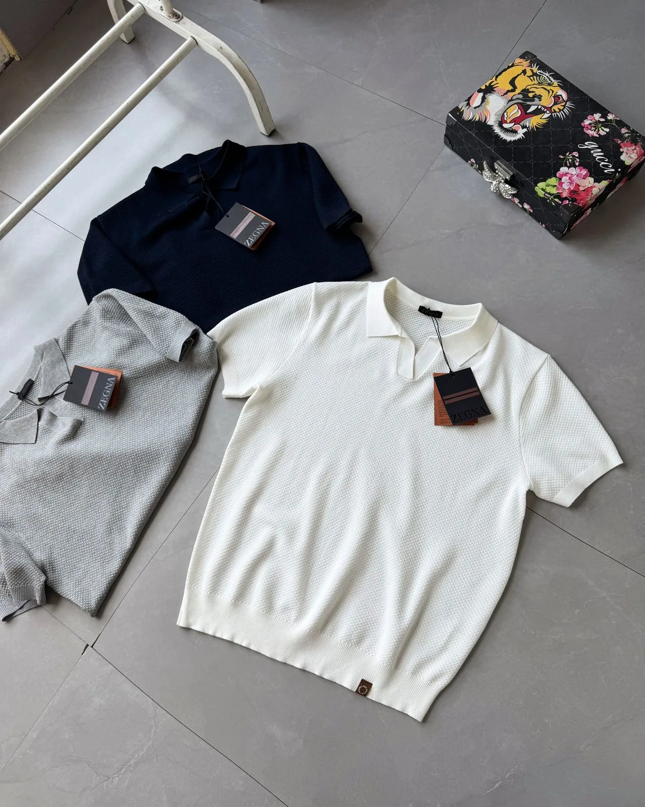 Zegnas neues, kurzärmliges Strick-T-Shirt für Frühjahr/Sommer mit französischem V-Ausschnitt und Stehsaum.