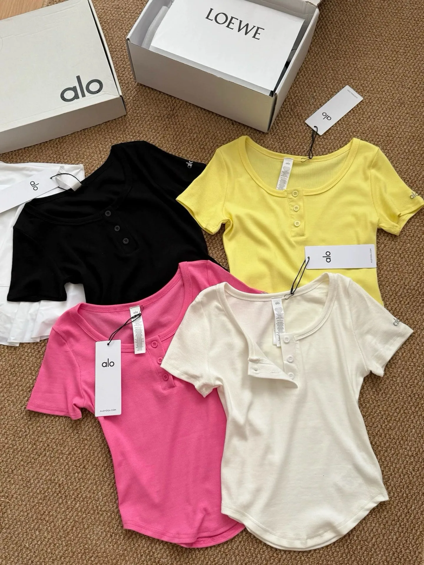 Neues ALO Baumwoll-Kurzshirt mit Knopfleiste. Figurbetonte Passform. Der U-förmige Saum ist sehr schmeichelhaft und vielseitig.