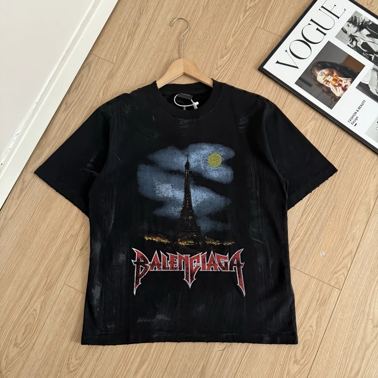 Ein Keypiece aus Balenciagas Frühjahr/Sommer-Kollektion, inspiriert von Paris, verbindet Street Art mit hochwertigen Texturen und kreiert so eine ausdrucksstarke Bildsprache. Das T-Shirt zeigt den Eiffelturm als zentrales Motiv. Handgemalte Inkjet-Graffiti und mehrschichtiger Farbverlaufsdruck sorgen für ein markantes und sofort erkennbares Design.