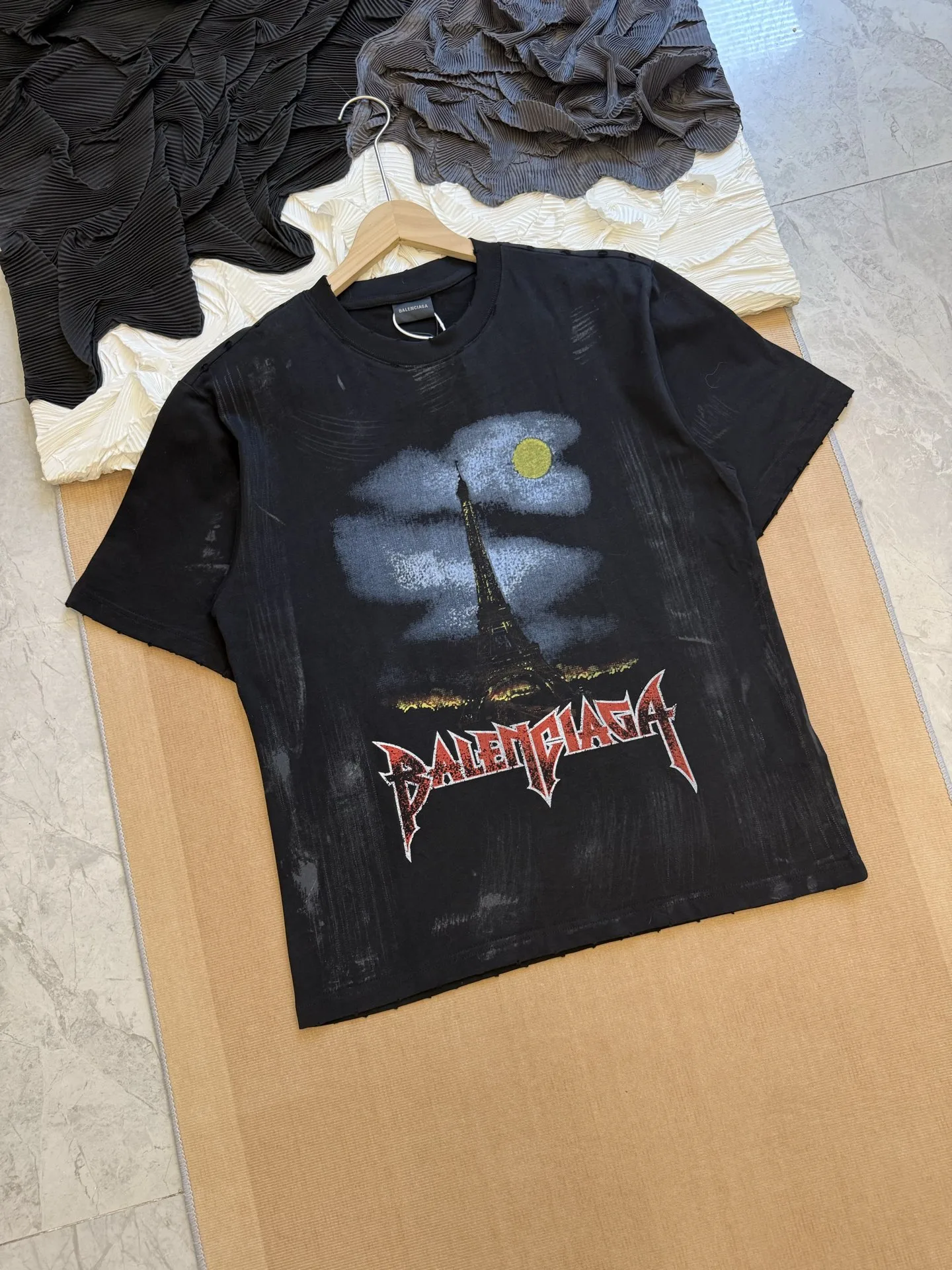 Ein Keypiece aus Balenciagas Frühjahr/Sommer-Kollektion, inspiriert von Paris, verbindet Street Art mit hochwertigen Texturen und kreiert so eine ausdrucksstarke Bildsprache. Das T-Shirt zeigt den Eiffelturm als zentrales Motiv. Handgemalte Inkjet-Graffiti und mehrschichtiger Farbverlaufsdruck sorgen für ein markantes und sofort erkennbares Design.