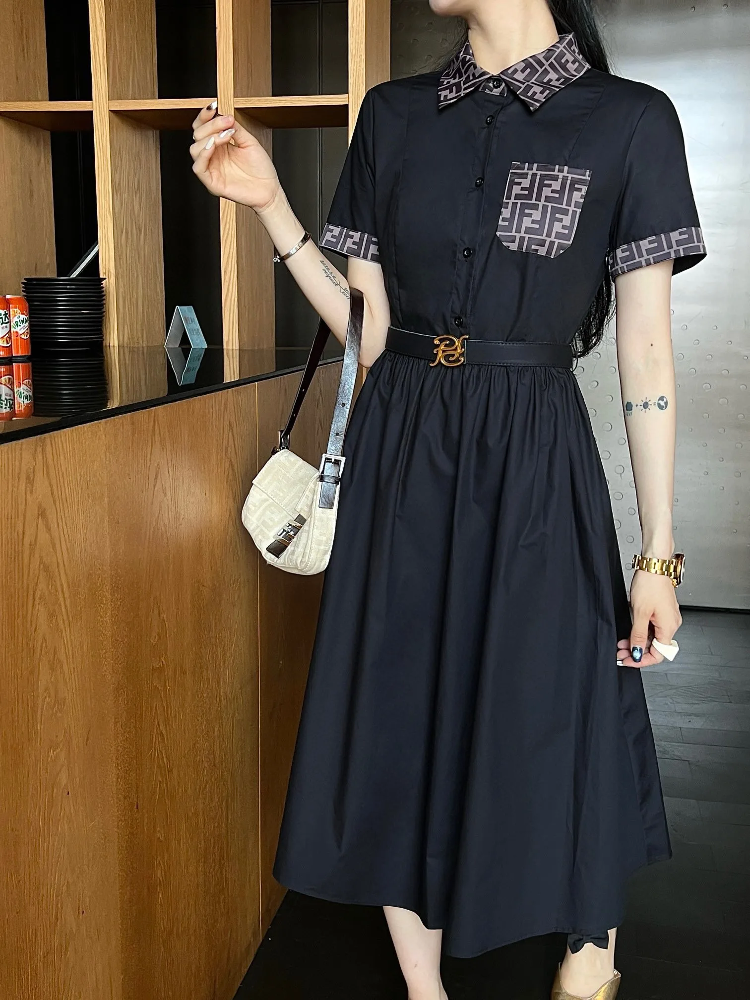 FEND*/SS Neues Frühjahr/Sommer-Hemdblusenkleid – Faltenrock / Doppel-F-Jacquard-Patchwork-Design / Stilvoll und elegant / Drei Größen