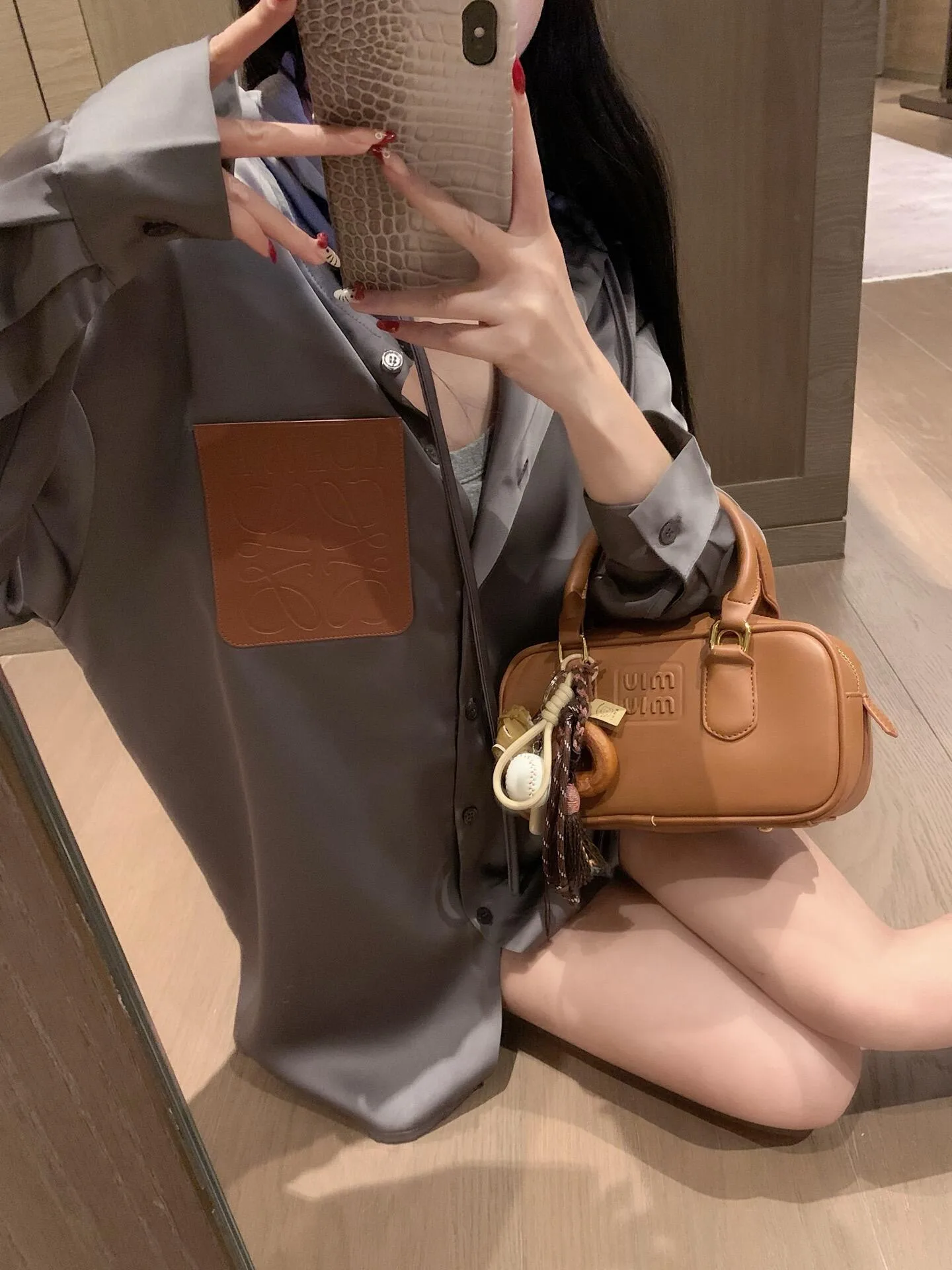 Hochwertiges Loewe Hemd Graues Leder Besticktes Design