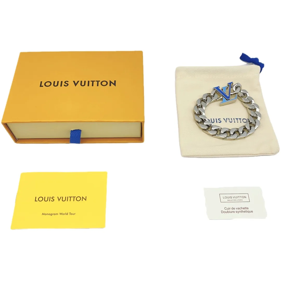 Silberfarbenes Louis Vuitton Herrenarmband mit Louis Vuitton Logo und blauen Buchstaben. LV Kettenarmband – Code: MM – Offizieller Preis: , RMB. Dieses LV Kettenarmband besticht durch einen leuchtend emaillierten LV-Logoverschluss und eine auffällige, verstellbare Länge. Zusammen mit den dicken Gliedern aus poliertem Metall sorgt das Armband für einen markanten und auffälligen Look. Details: Metall, Emaille, LV-Logoverschluss, verstellbar, Made in Italy!