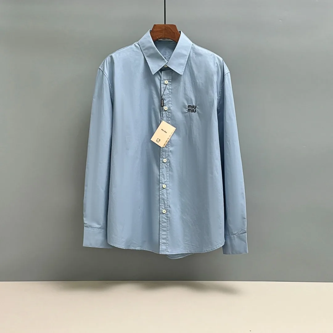 Maßgefertigtes Hemd aus klassischem Tencel Paris-Imitat in Leinwandbindung. Lockere Passform. Das modellierte Oberteil mit glatten, natürlichen Linien. Von der Schulter über die Taille bis zum Saum verlaufen die Linien fließend, ohne überflüssige Falten oder Volumen – für einen klaren und entspannten Look. Individuelle Knöpfe mit Miu Miu L-Gravur. Das Monogramm auf der Brust besticht durch präzise Nähte, glatte Linien und natürliche Übergänge. Das Muster ist dreidimensional und hat keine ausgefransten Kanten.