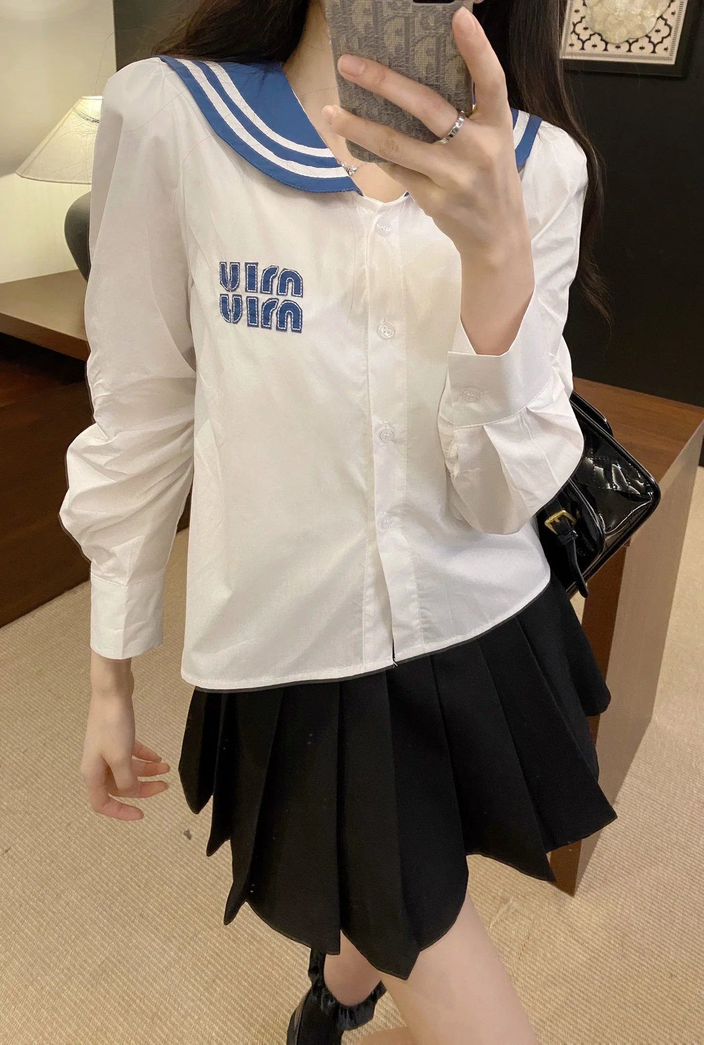 Miumiu Miu Miu Kurzes Hemd mit kontrastierendem marineblauem Kragen und gesticktem S-Schriftzug vorne und hinten