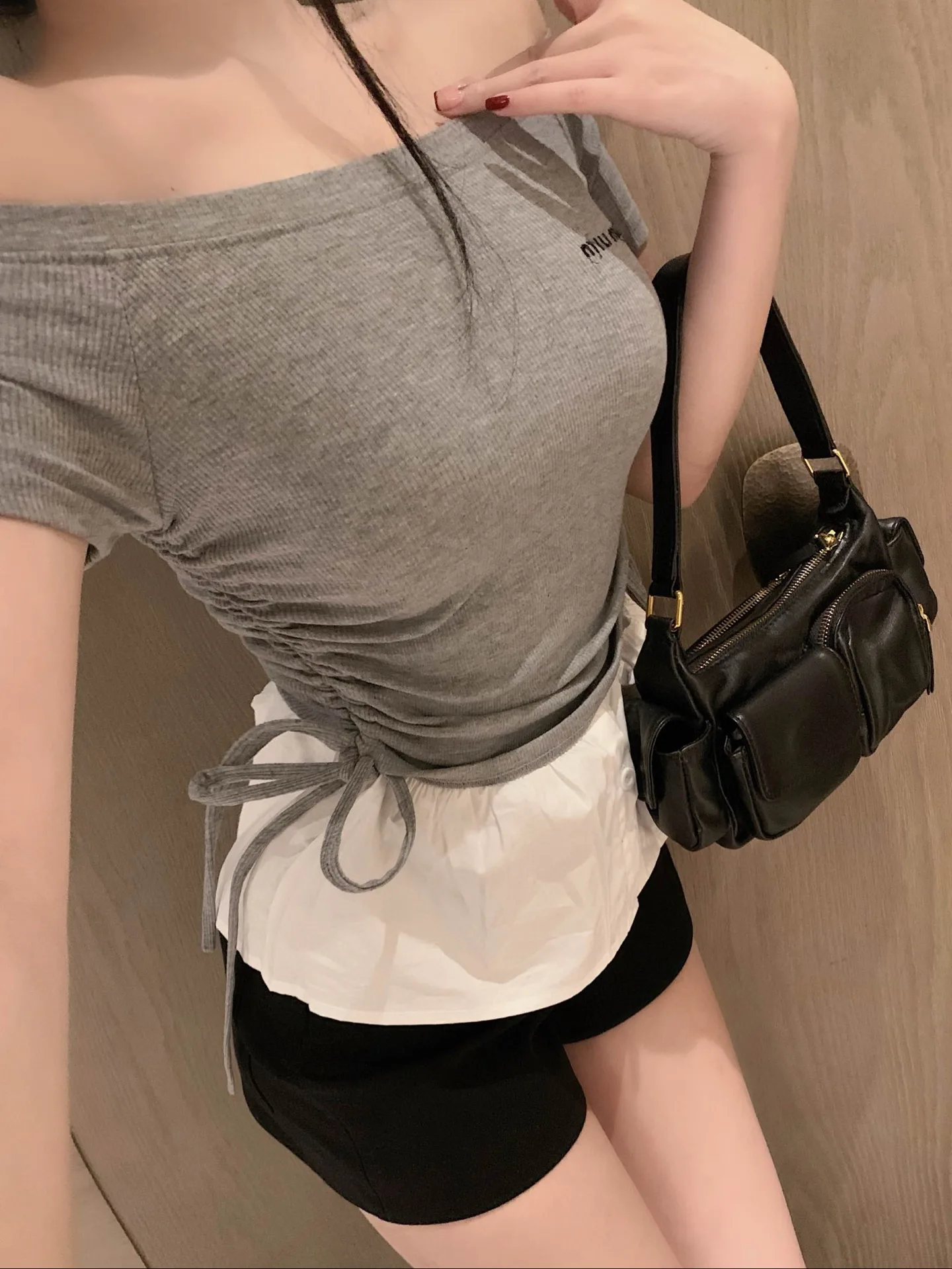 Miumiu Miu – Schulterfreies Hemdblusenkleid mit aufgesticktem Schriftzug und Kordelzug