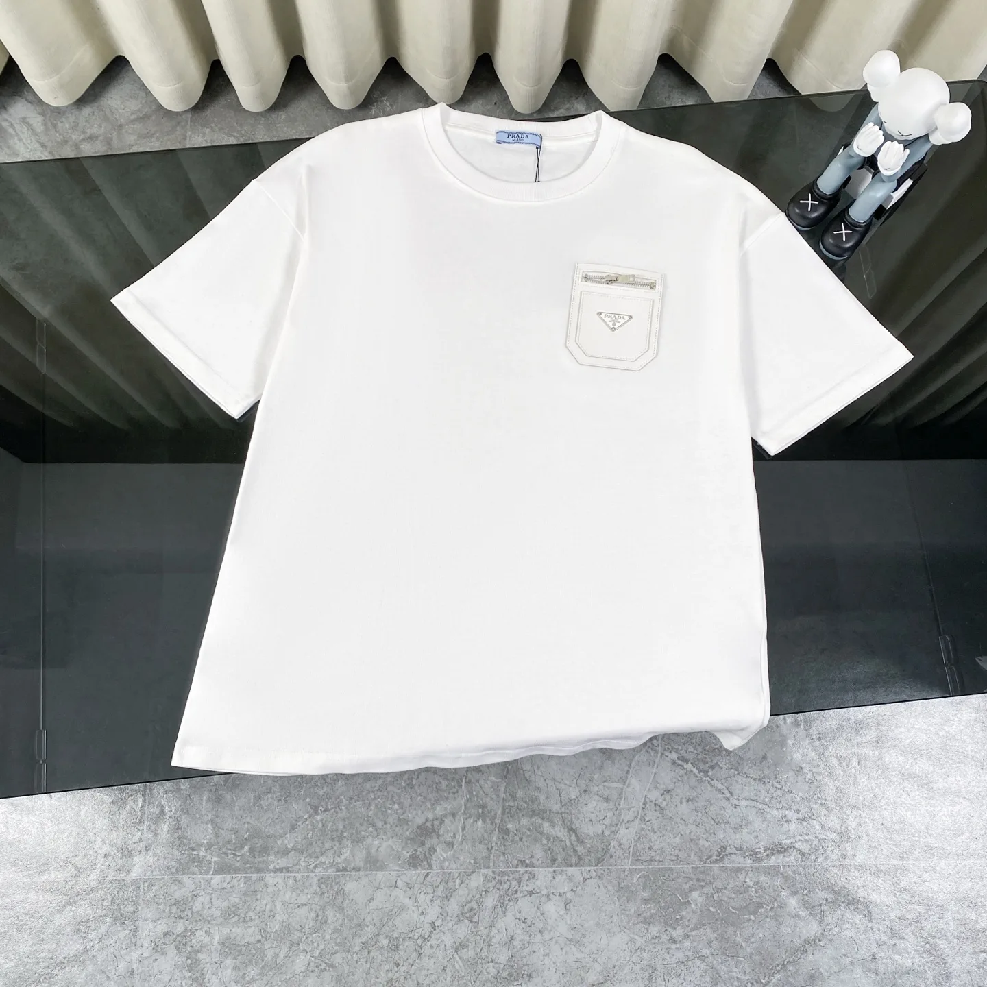 Pradas neues, lässiges, kurzärmliges T-Shirt aus Leder mit aufgesetzten Taschen, Reißverschluss und Rundhalsausschnitt