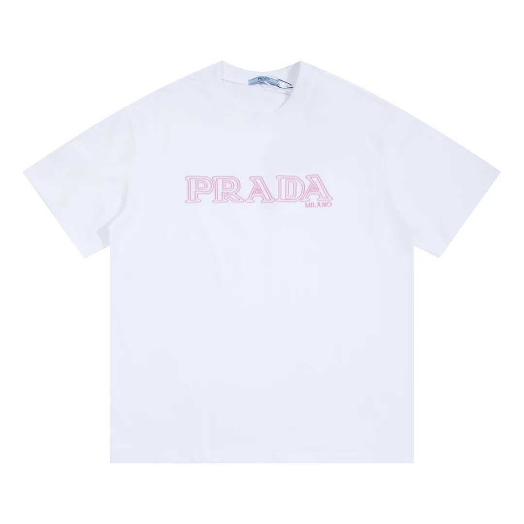 Prada Early Spring New Style. Individueller G-Doppelgarn-Baumwollstoff. Gewaschen und behandelt für Form- und Farbbeständigkeit. Importierte, hochdichte Stickerei des rosa Co-Branding-Logos. Unisex-Kurzarm-T-Shirt. Farben: Schwarz und Weiß.
