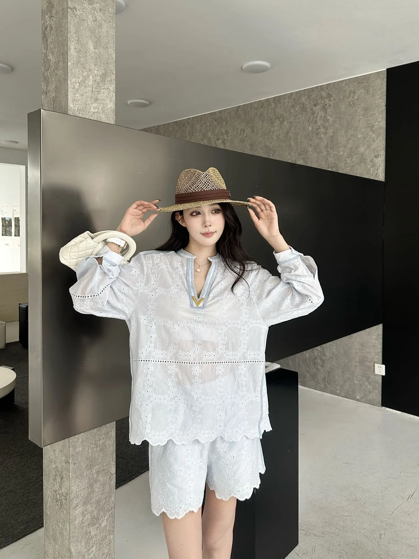 Ein sommerliches, lässiges Set mit Stickereien. Dieses Rundhals-Shirt mit V-Ausschnitt und die hoch taillierten Shorts kreieren eine vielseitige Silhouette. Sie kaschieren mühelos Übergewicht und sorgen für einen schlankmachenden Effekt. Der zarte V-Ausschnitt ist perfekt verarbeitet und sorgt für einen entspannten, lässigen Look mit einem Hauch von Sexyness. In Kombination mit elastischen Shorts betont es gekonnt die Taille, akzentuiert durch klassische Metall-V-Ausschnitt-Elemente. Dieses stylische Outfit ist unglaublich schick und jugendlich und versprüht eine jugendliche Ausstrahlung. Erhältlich in zwei Farben.