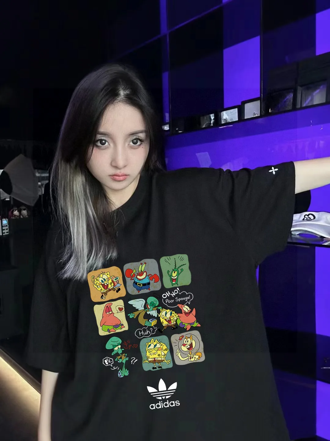 Der Adidas Trefoil-Stoff präsentiert eine Co-Branding-Kollektion mit SpongeBob Schwammkopf-Figuren und bedruckten Kurzarmshirts.
