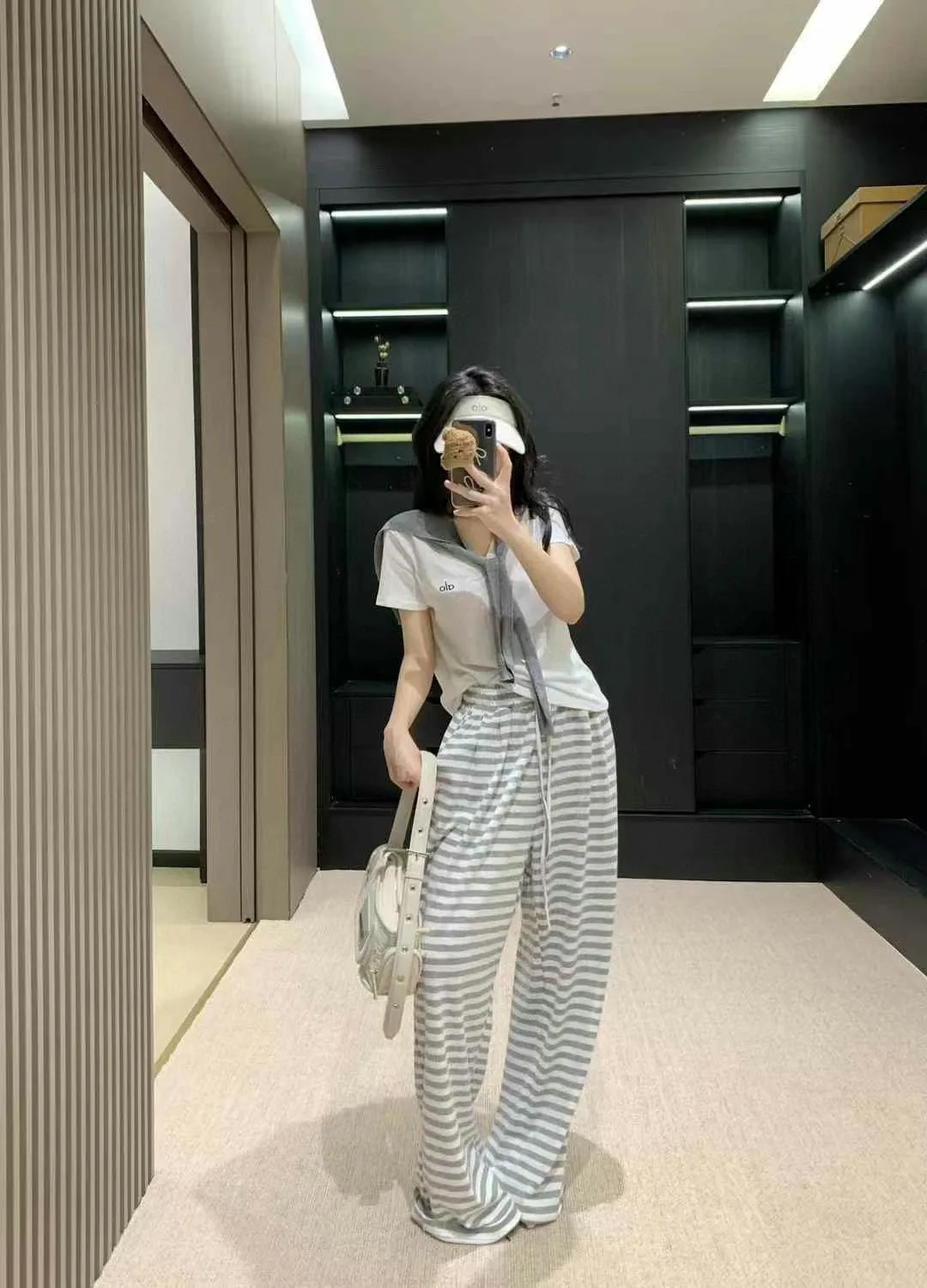 Kurzärmliges T-Shirt mit V-Ausschnitt und gesticktem Alo-Schriftzug, grauem Schal, elastischem Kordelzugbund und gestreifter Hose. Dreiteiliges Set.