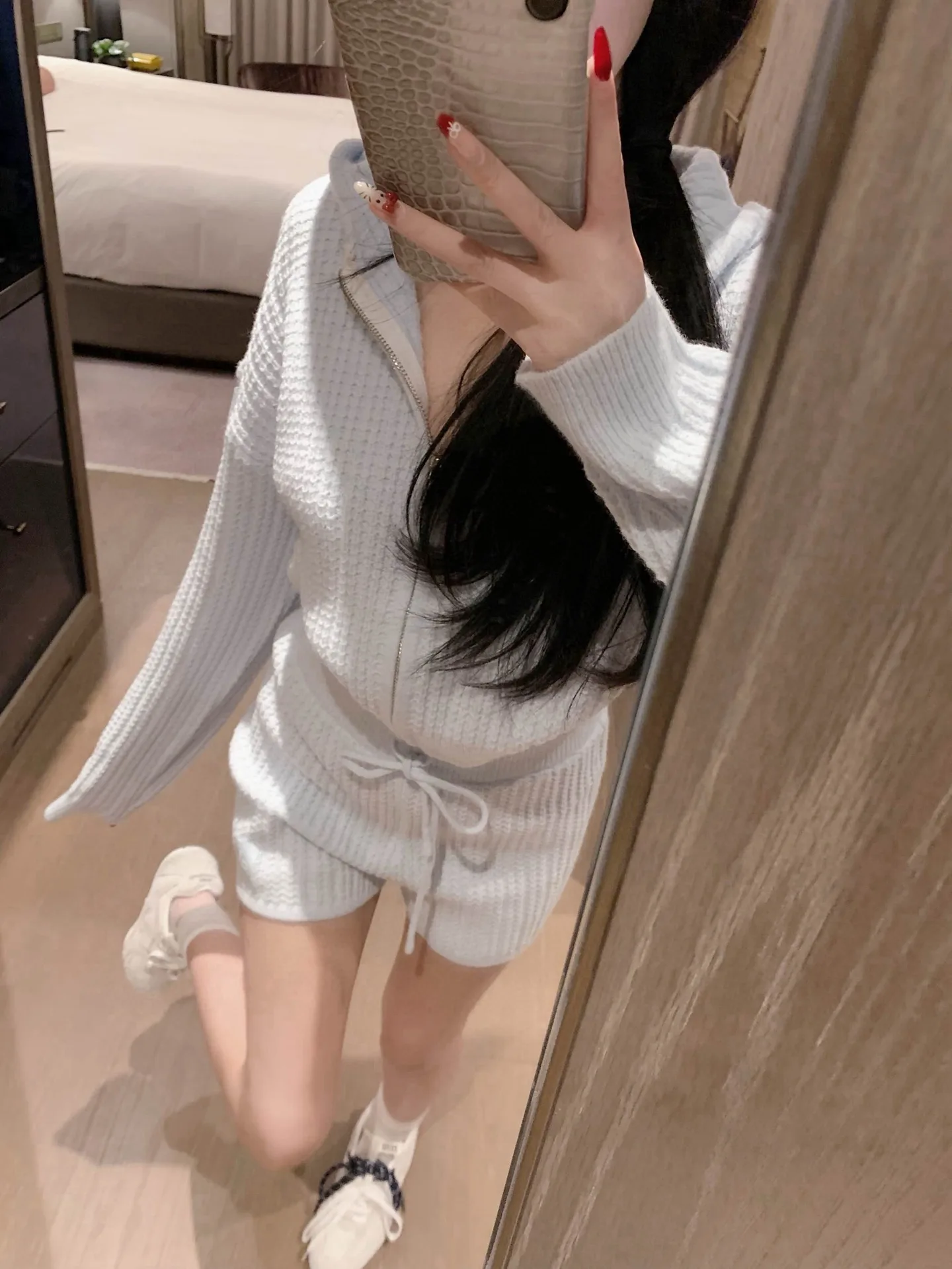 Alo Kapuzenjacke mit Reißverschluss und Monogramm, Shorts mit Kordelzug und Waffelstrick-Set