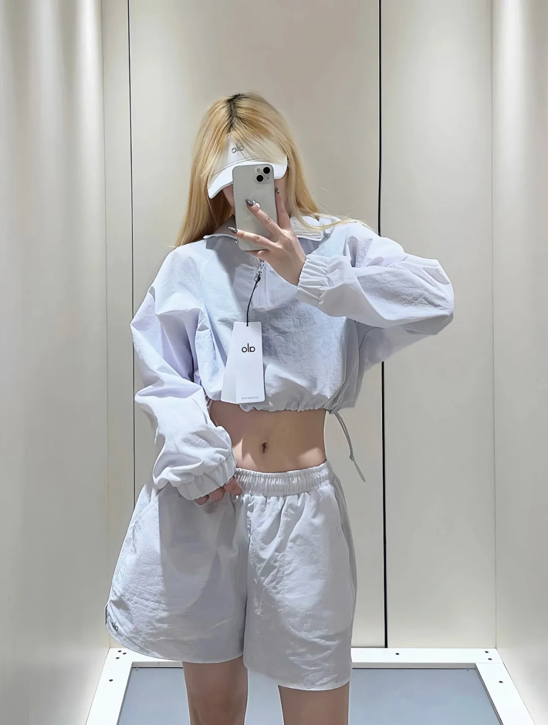 Sonnenschutz-Set aus kurz geschnittenem Top mit Halbreißverschluss und Shorts mit elastischem Bund und Alo-Buchstaben-Print