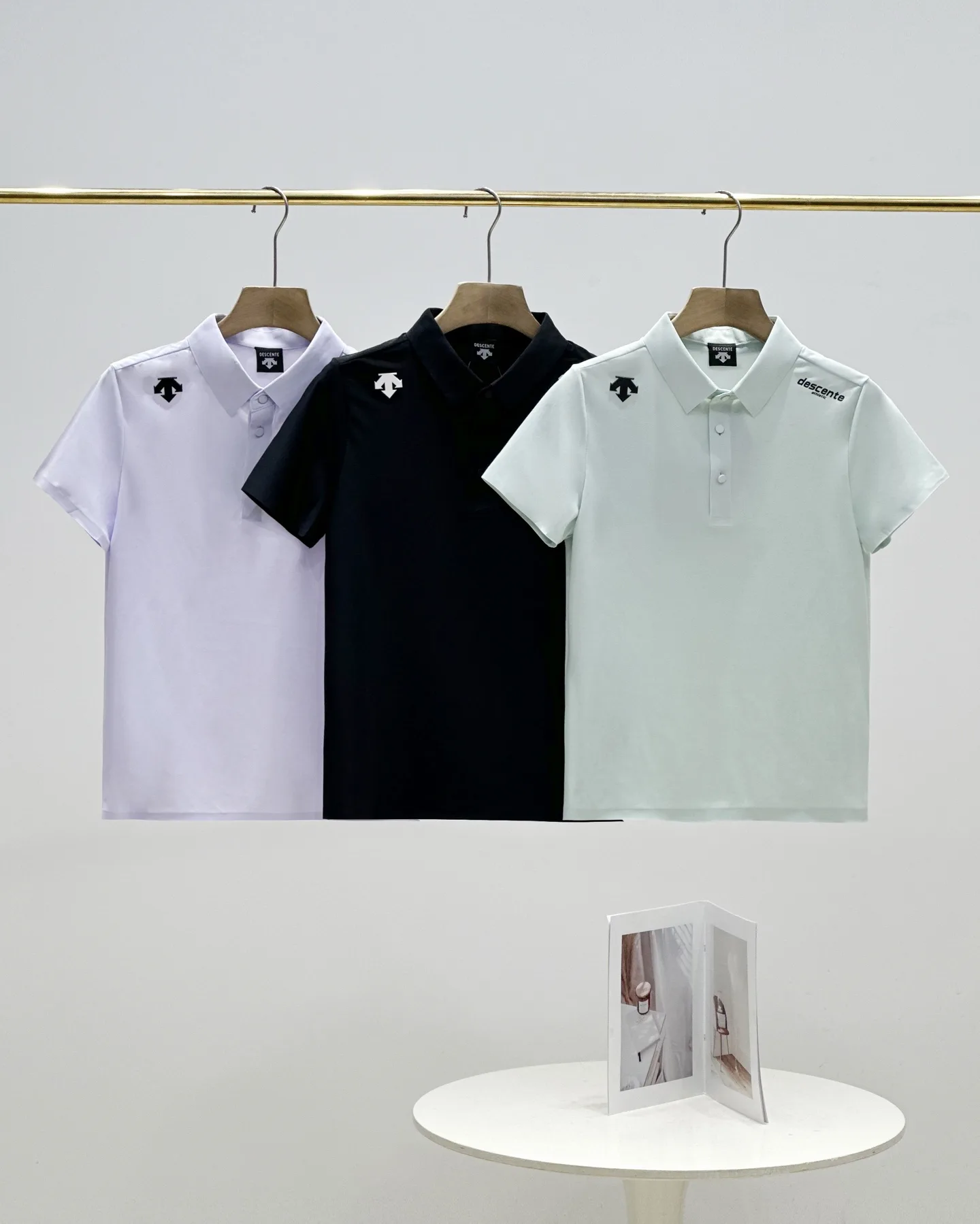 Hier sind einige Fotos des offiziellen DESCENTE Damen-Sonnenschutz-Kurzarm-Golfpoloshirts. Dieses kühlende, schnelltrocknende Poloshirt aus Eisseide verfügt über eine doppelte Kühltechnologie und ein schlichtes, elegantes Design für entspanntes Sommerwetter.