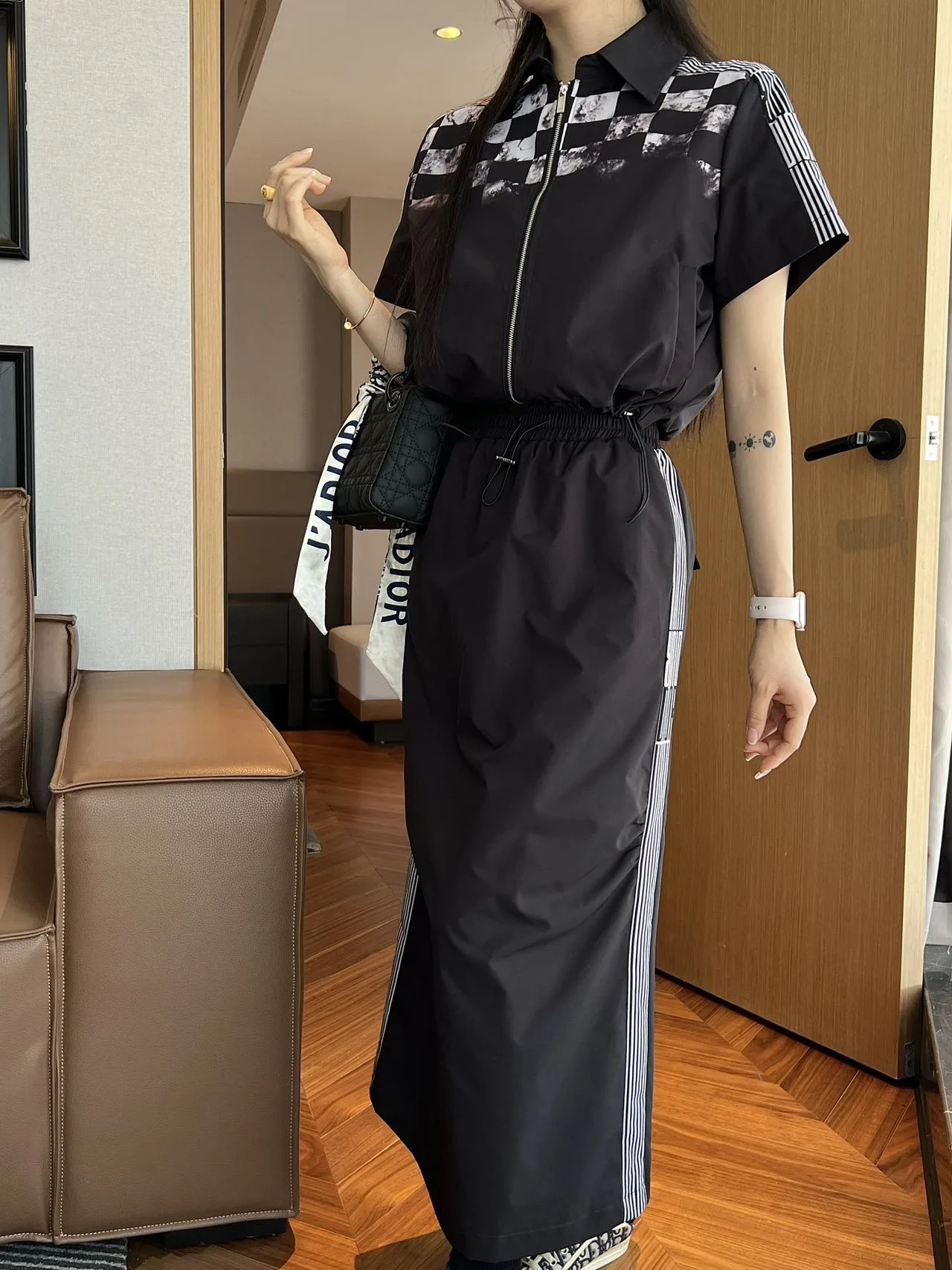 Dieses neue Frühjahr/Sommer-Kostüm besticht durch ein einzigartiges kontrastierendes Karomuster am Oberteil, einen verstellbaren Bund und einen elastischen Rock mit Seitenstreifen und Logo-Print. Dieses Set vereint dezenten Luxus und Chic. Erhältlich in zwei Farben.