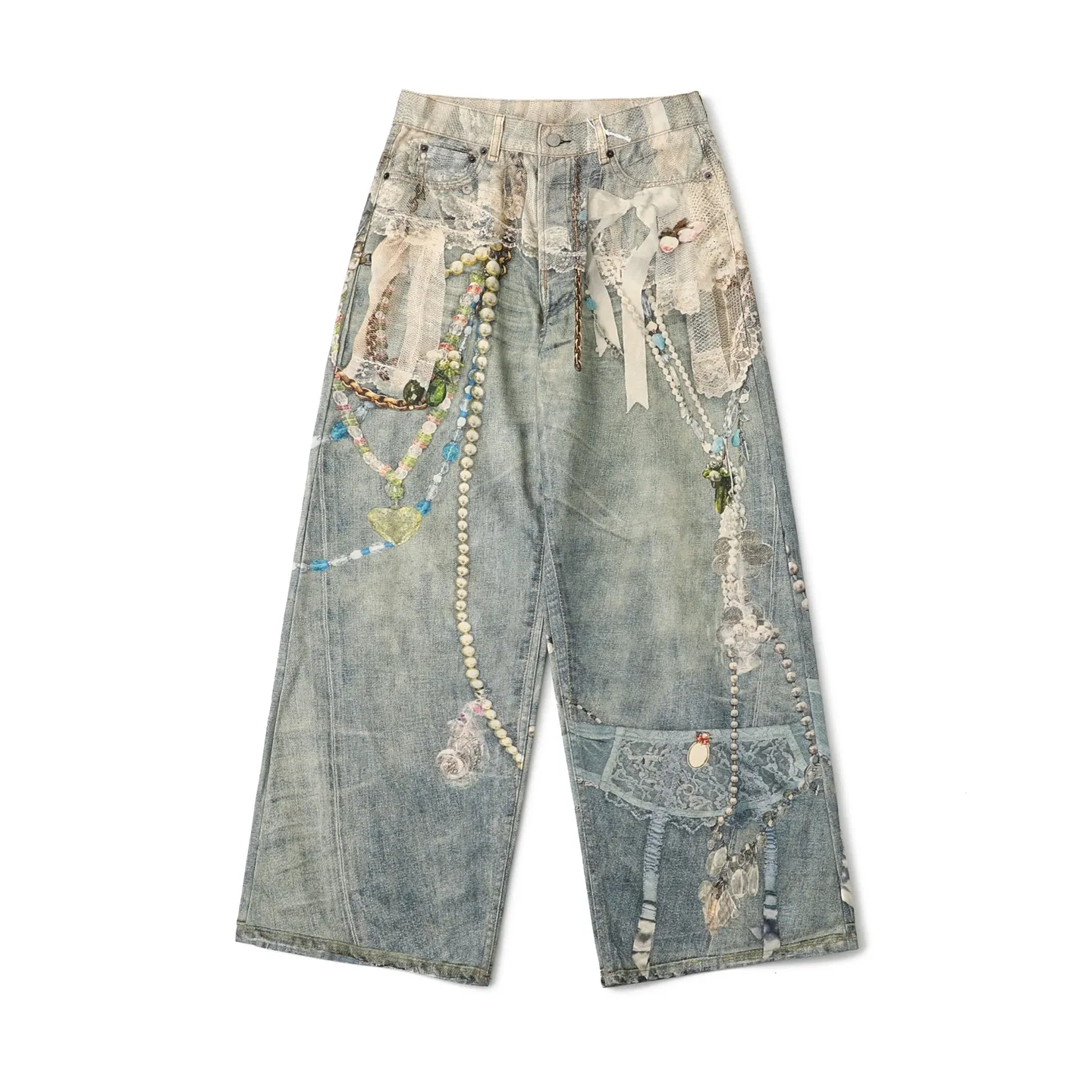 Acne Studios FW Jeans mit Spitze und Perlenkette, 3D-Druck, lockere Passform, Unisex.