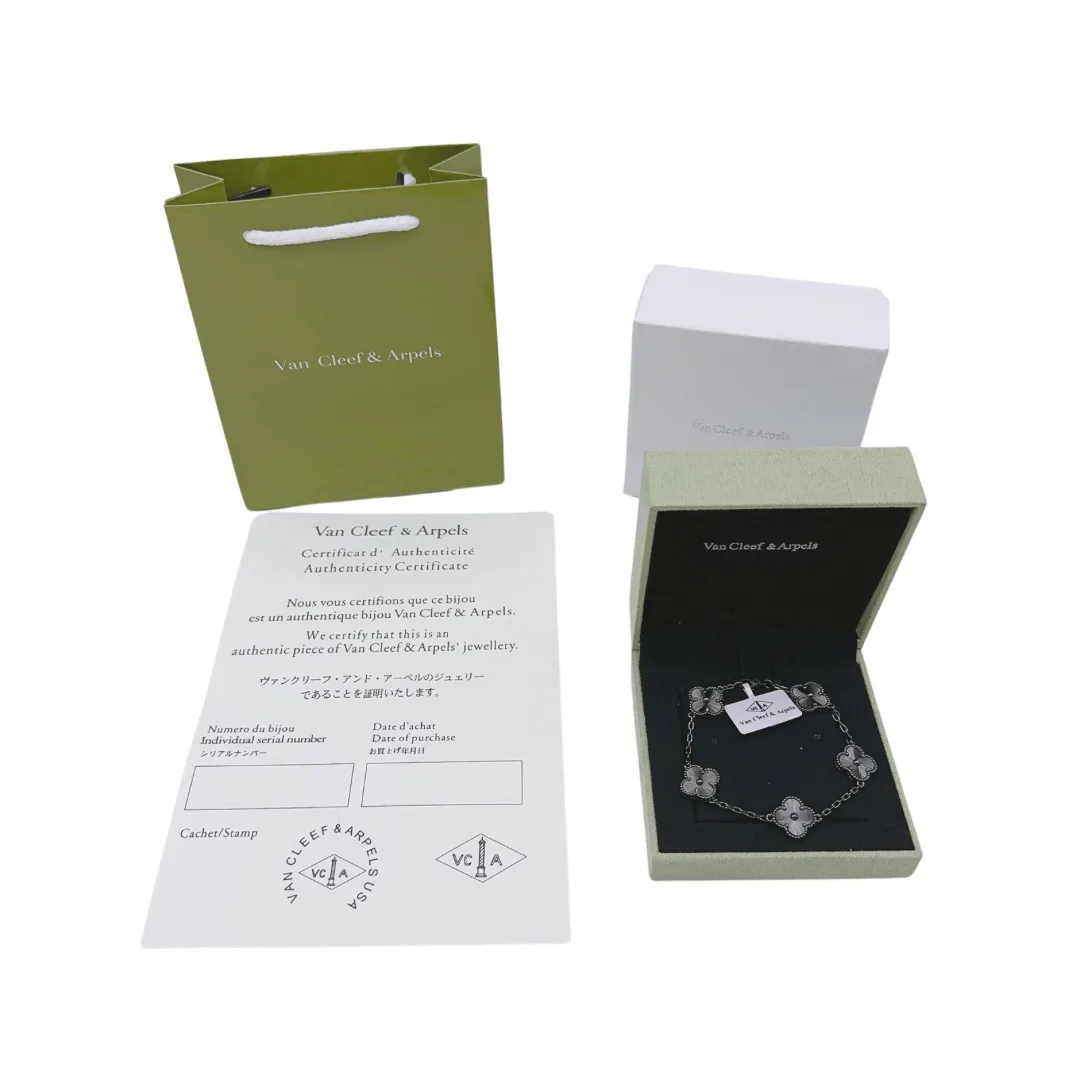 Eine Premium-Edition exklusiv bei Dewu erhältlich! Dieses Van Cleef & Arpels Lucky Four-Leaf Clover Five-Flower Laser Black Warrior Armband ist ein Klassiker von Van Cleef & Arpels. Sein einzigartiges Kleeblatt-Design und seine wunderschöne Bedeutung sind unglaublich ansprechend und machen es zu einem Favoriten vieler Frauen. Das vierblättrige Kleeblatt symbolisiert Glück, und es an einem Armband zu tragen, verspricht Segen. Die vier Blätter eines vierblättrigen Kleeblatts stehen zudem für Reichtum, Gesundheit, Ruhm und Liebe. Es ist das perfekte Geschenk für Freunde und Liebste! Die Vintage Alhambra Kollektion von Van Cleef & Arpels ist eine originalgetreue Nachbildung des originalen Alhambra-Schmucks aus dem Jahr 2006. Sein einzigartiges, zeitloses und elegantes Design besticht sofort. Diese Glückssymbole sind vom vierblättrigen Glücksmotiv inspiriert und mit runden Gelbgoldperlen akzentuiert!
