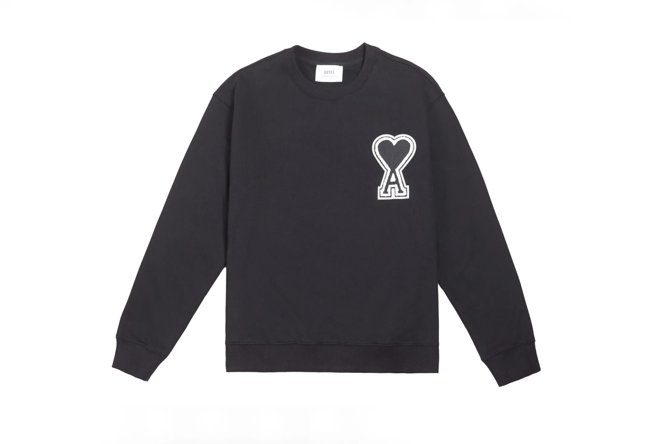 AMIs neuer Herbst-/Winter-Klassiker mit herzförmigem Herz-Emblem und Rundhals-Pullover. Maßgefertigt aus reiner Baumwolle. Hochwertiger, neuer Hauptstoff, gewaschen. Unisex-Stil. Farbe: Schwarz mit schwarzem Herz. Größen: S–XL.