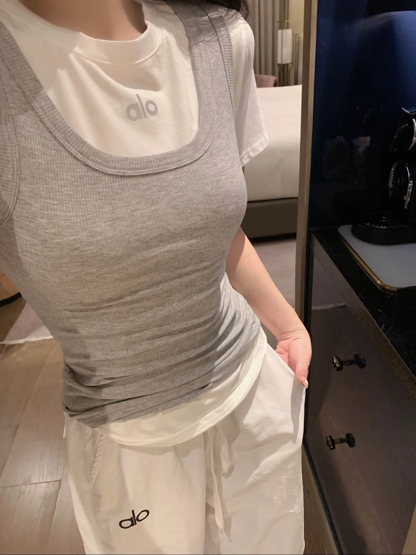 Zweiteiliges, geripptes Tanktop mit kurzen Ärmeln und Alo-Buchstaben-Print