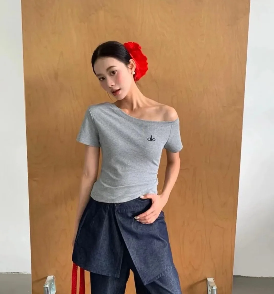 Alo besticktes Slim Fit Off-Shoulder-Kurzarm-T-Shirt