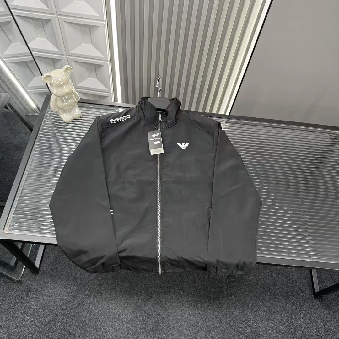 Empfohlene Oberbekleidung für den Frühherbst: EA Armanis bedruckte, winddichte Stehkragenjacke. Alle drei Etiketten sind identisch mit denen auf der offiziellen Website. Zoomen Sie hinein, um Details zu sehen. Foto mit der Originalkamera aufgenommen.