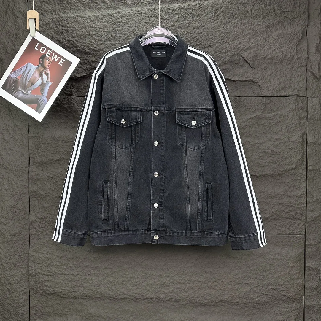 Balenciagas neue Jeansjacke mit drei Streifen und verwaschenem Design – ein schlichter Pärchen-Style.