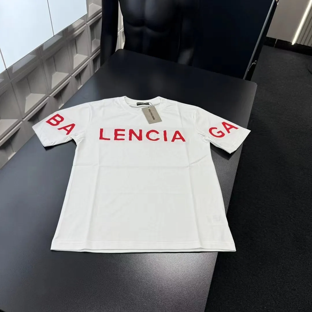 Empfehlenswerte neue Kurzarmshirts von Balenciaga mit auffälligem roten Schriftzug und Strassbesatz. Alle drei Logos sind enthalten, passend zur offiziellen Website. Zoomen Sie heran, um Details zu sehen. Foto mit der Originalkamera aufgenommen.